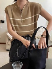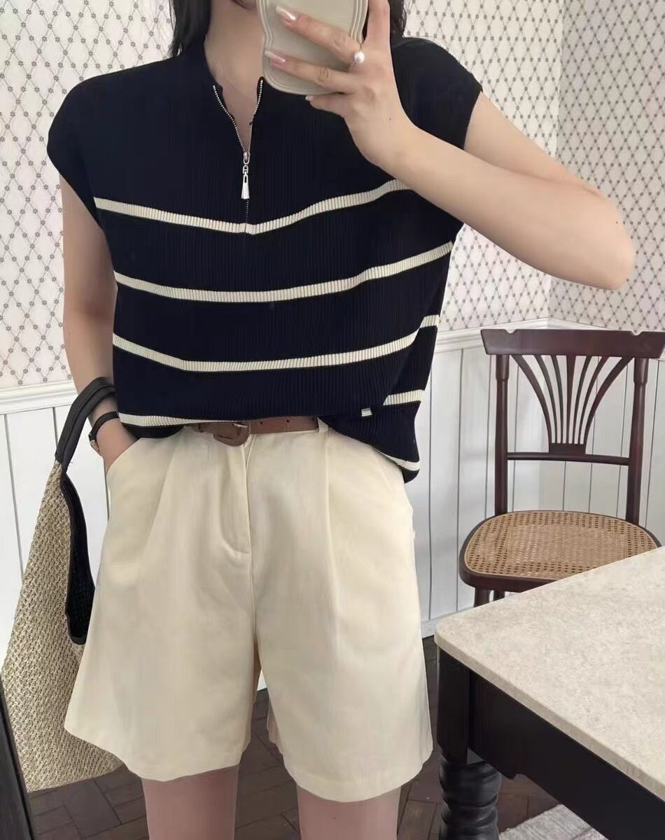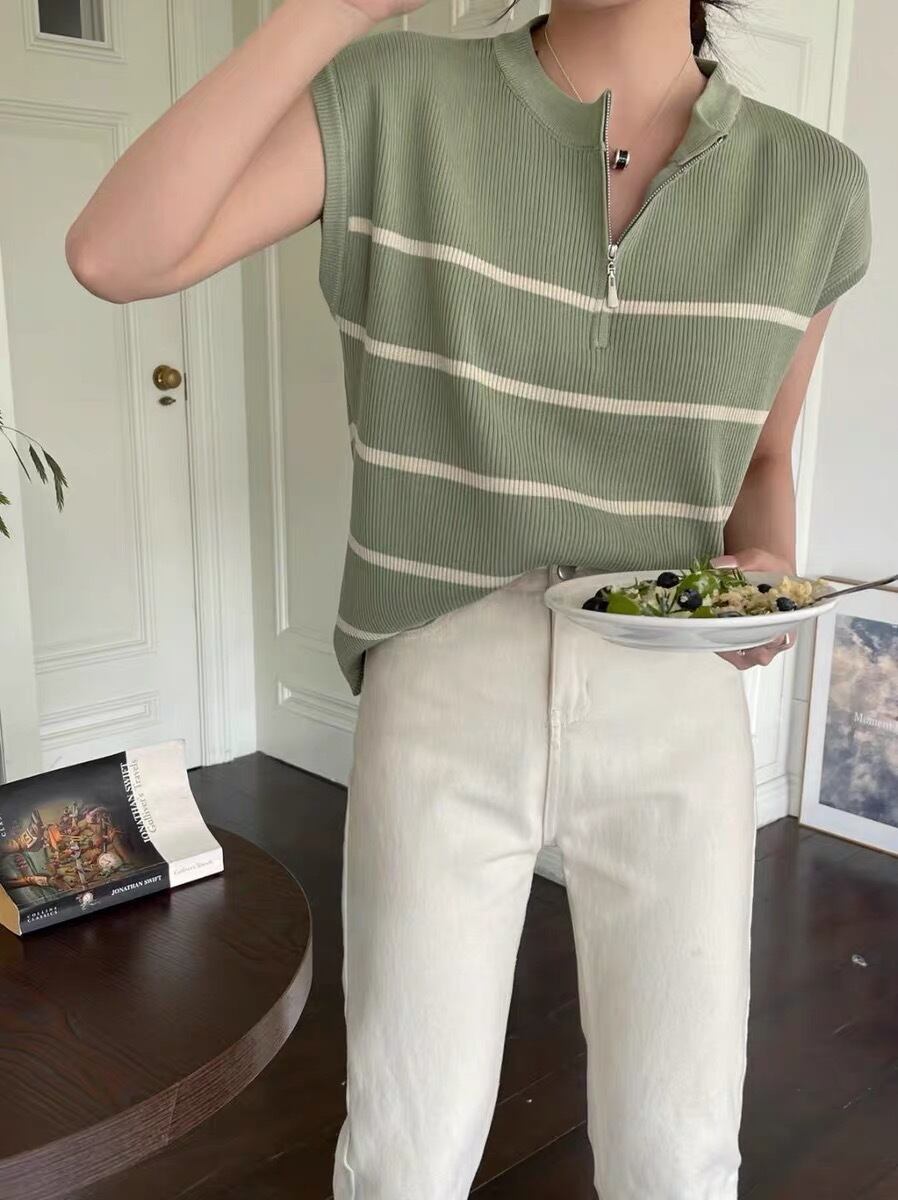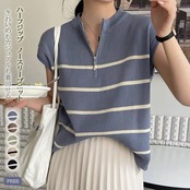 【海外からの取り寄せ】 2025新作 レディース ハーフジップ ノースリーブ ニット ボーダー トップス カジュアル #[tops572_11800]【送料込み】【250712】