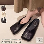 ・上品な艶感のあるレザー調素材のスクエアトゥミュール。