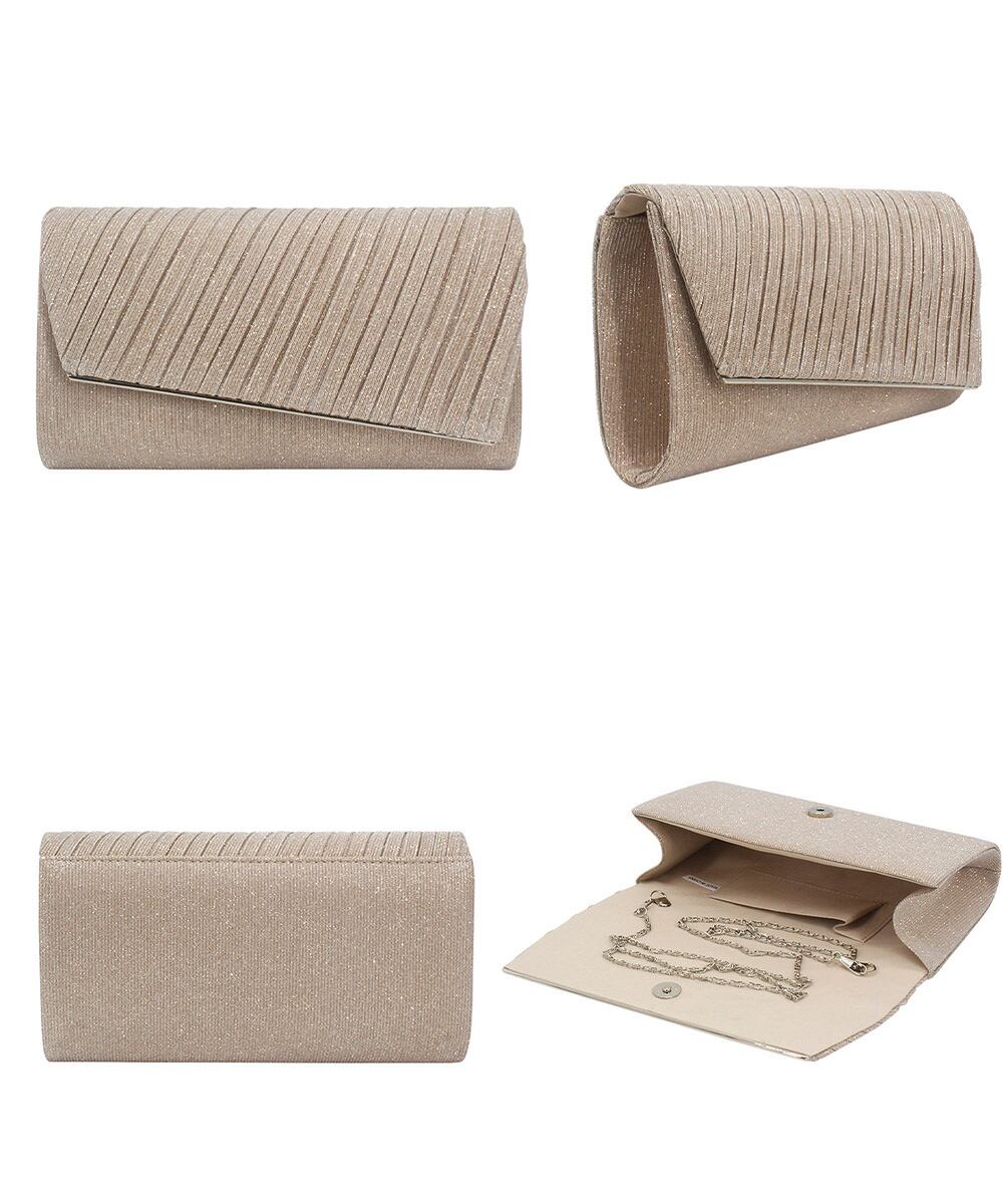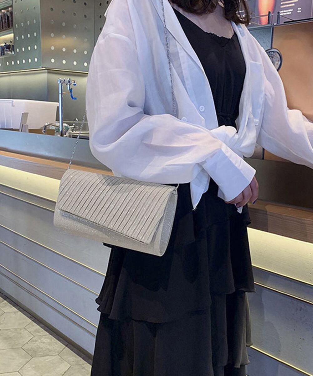 プリーツ加工をほどこしたサテン生地が上品なキラキラパーティーバッグ