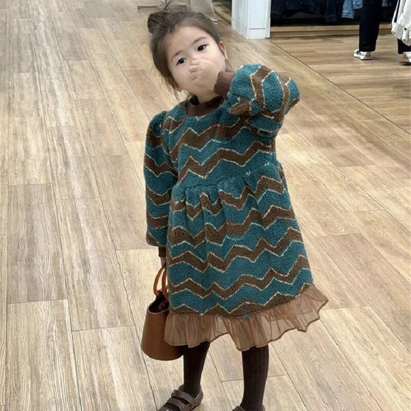 【海外からの取り寄せ】2023新作 韓国子供服 子供 キッズ ワンピース 長袖 裾フリル ボーダー 130 120 110 100 90 グリーン #[kids673_21800]【送料込み】【250706】