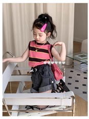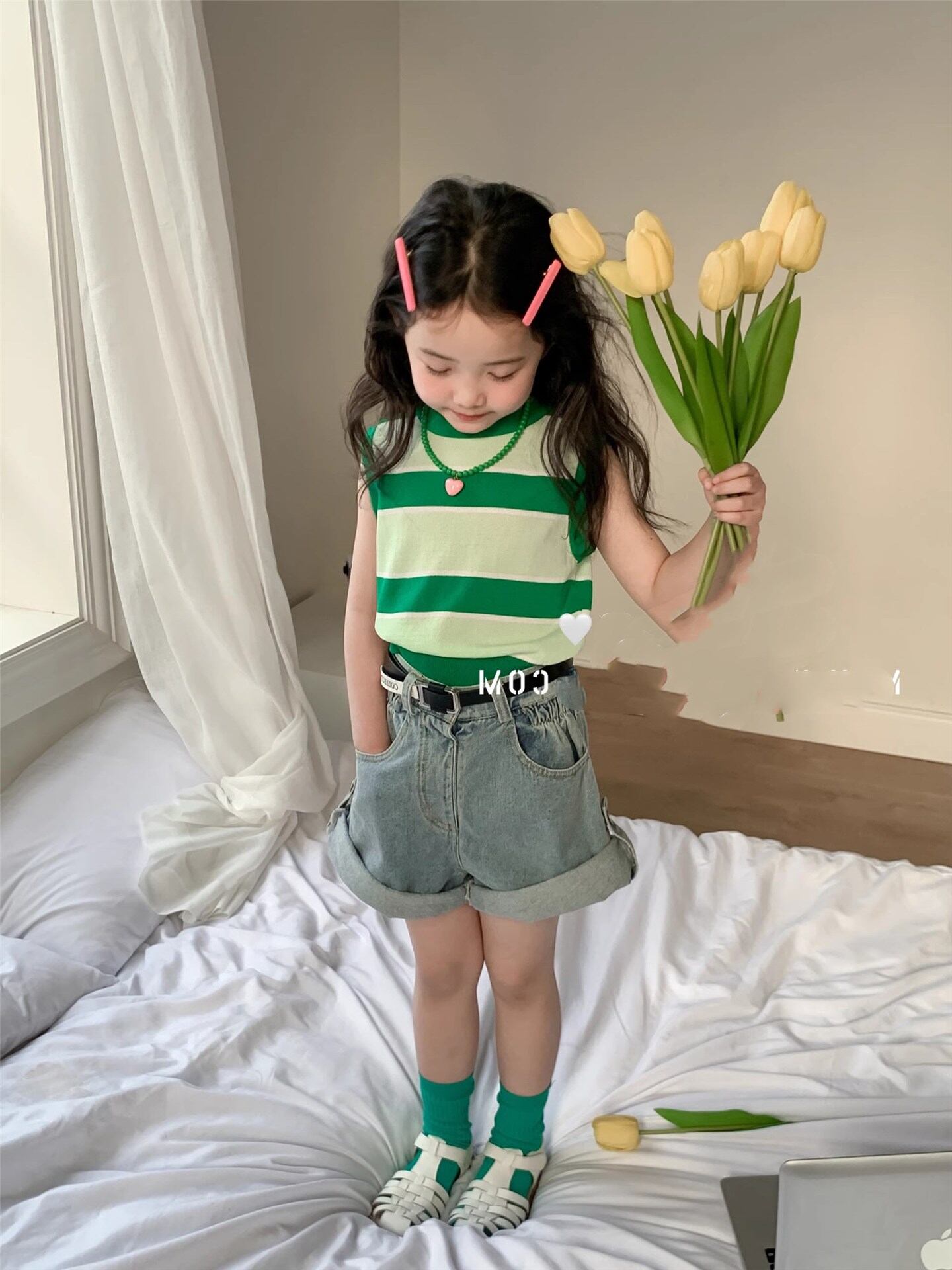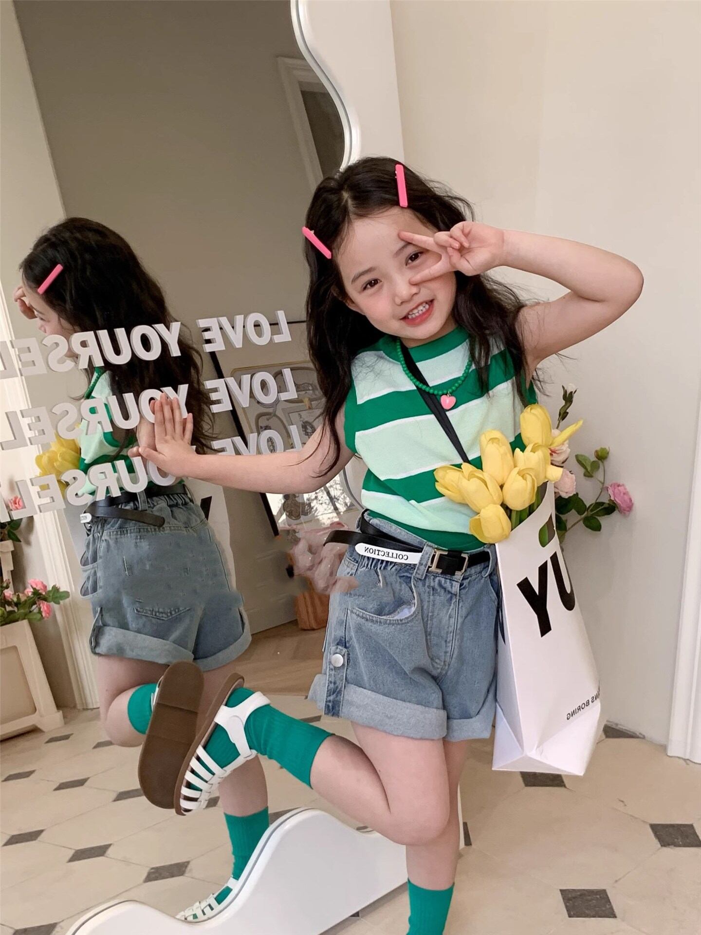 ・かわいいベルトがついた女の子向けデニムショートパンツ。