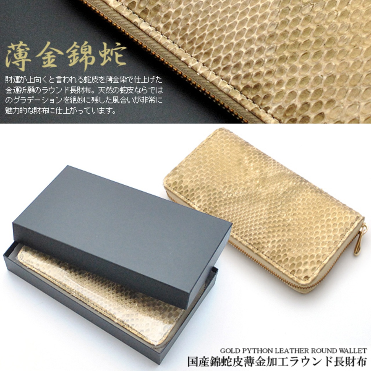 財運が上向くと言われる錦蛇革を薄金染めで仕上げた金運祈願のラウンド長財布。