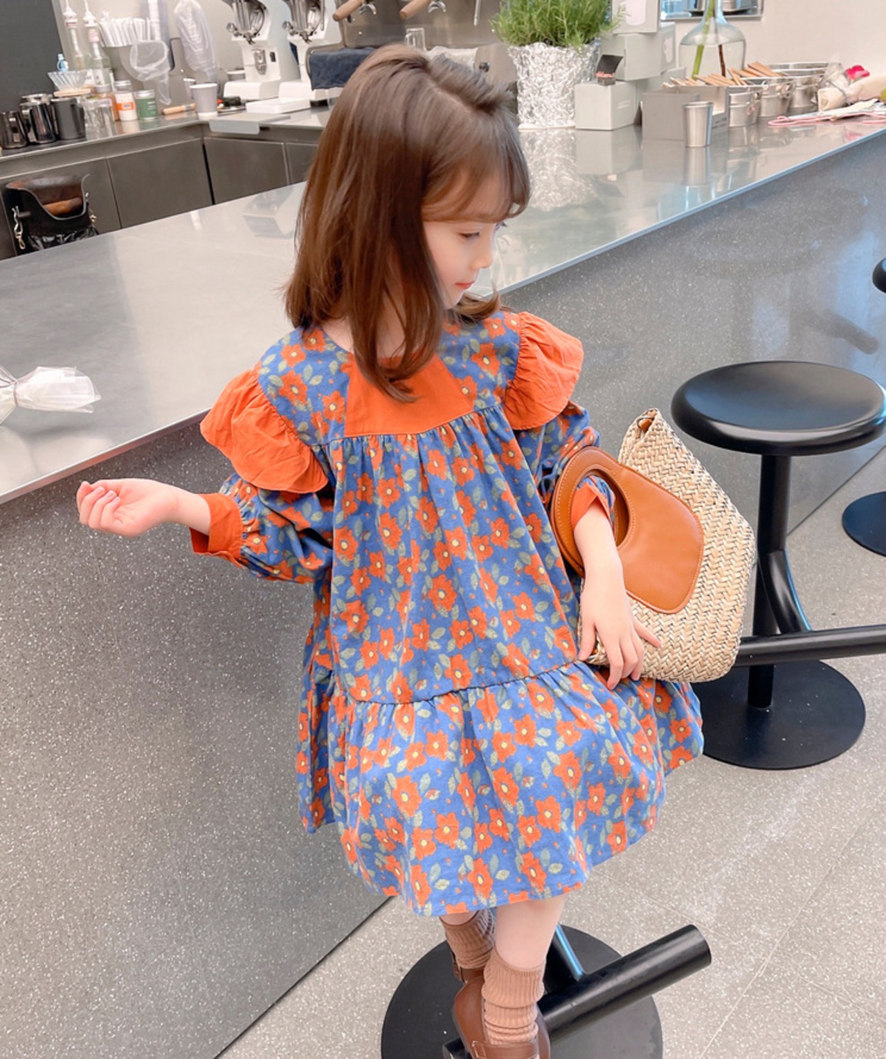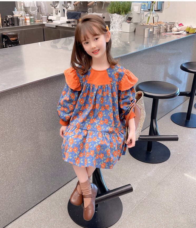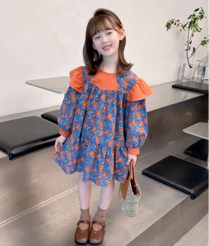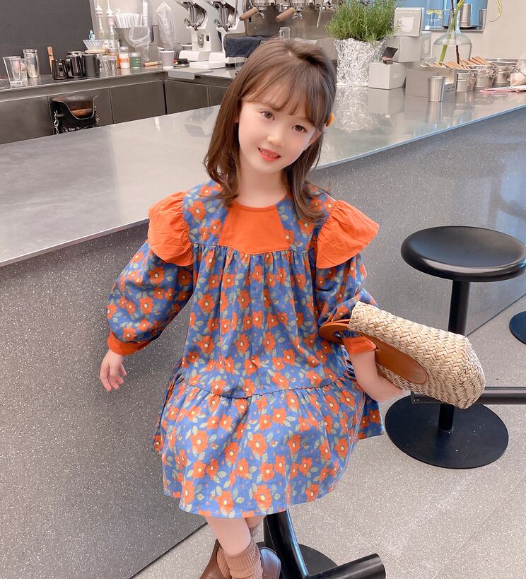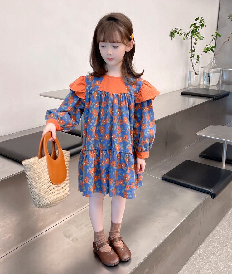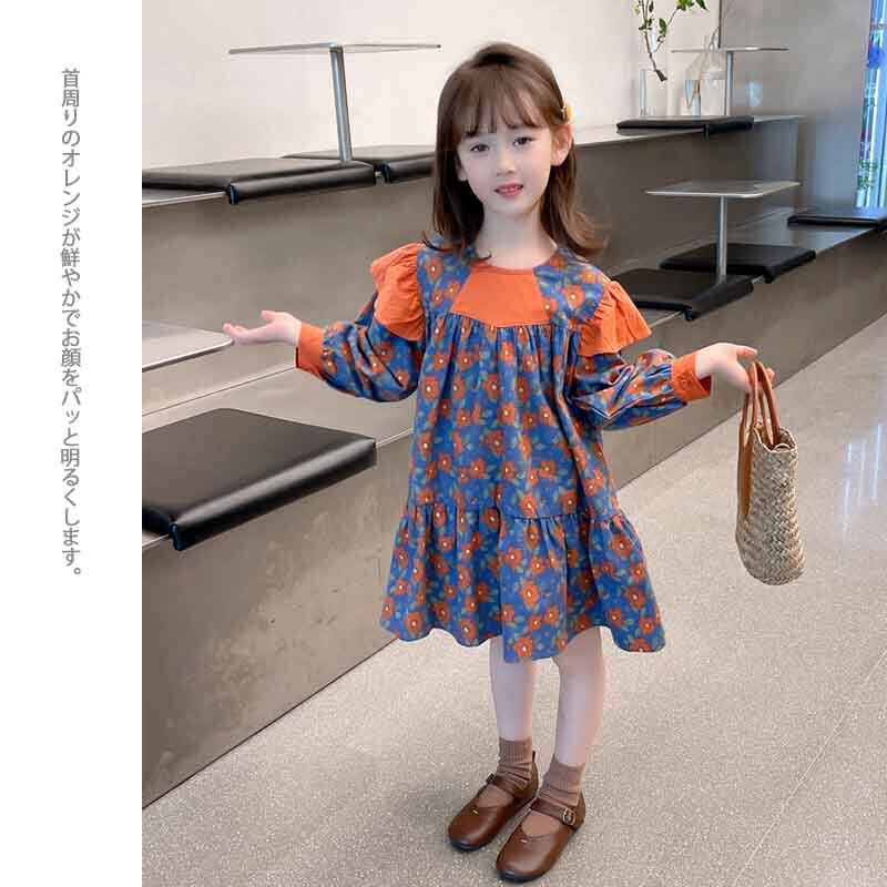 【海外からの取り寄せ】2023新作 韓国子供服 子供 キッズ 長袖 トップス ワンピース 花柄 肩フリル かわいい オレンジ ブルー #[kids522_13800]【送料込み】【250706】