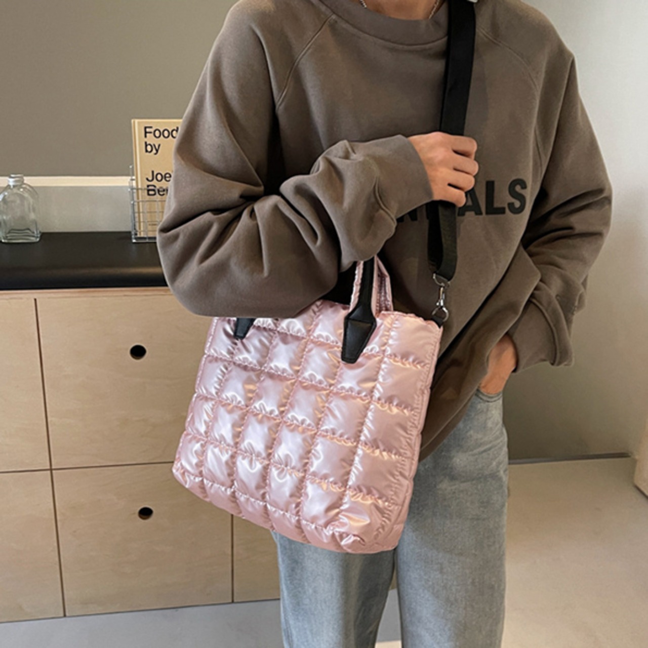 ・華やかな光沢感のあるキルティングトートバッグ。