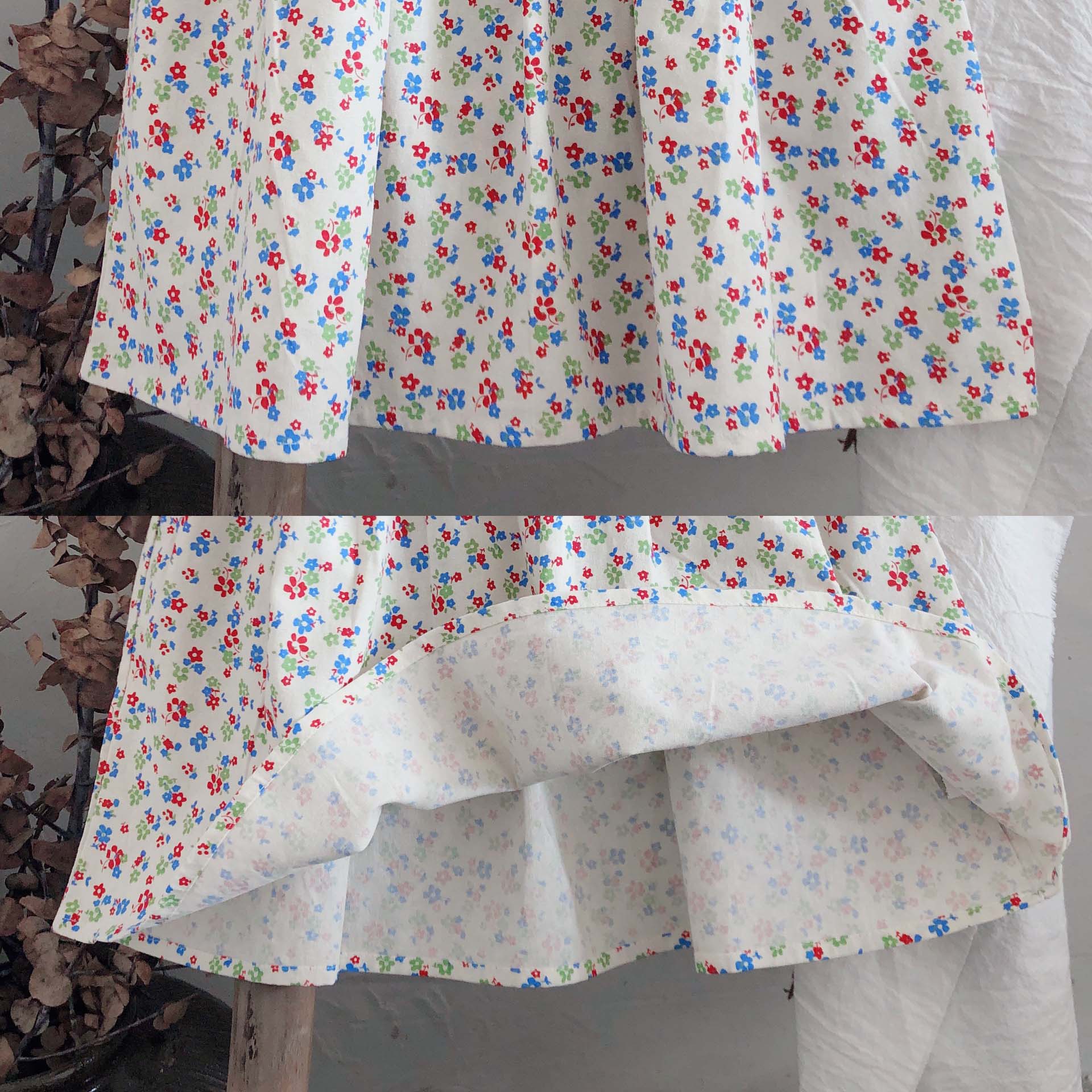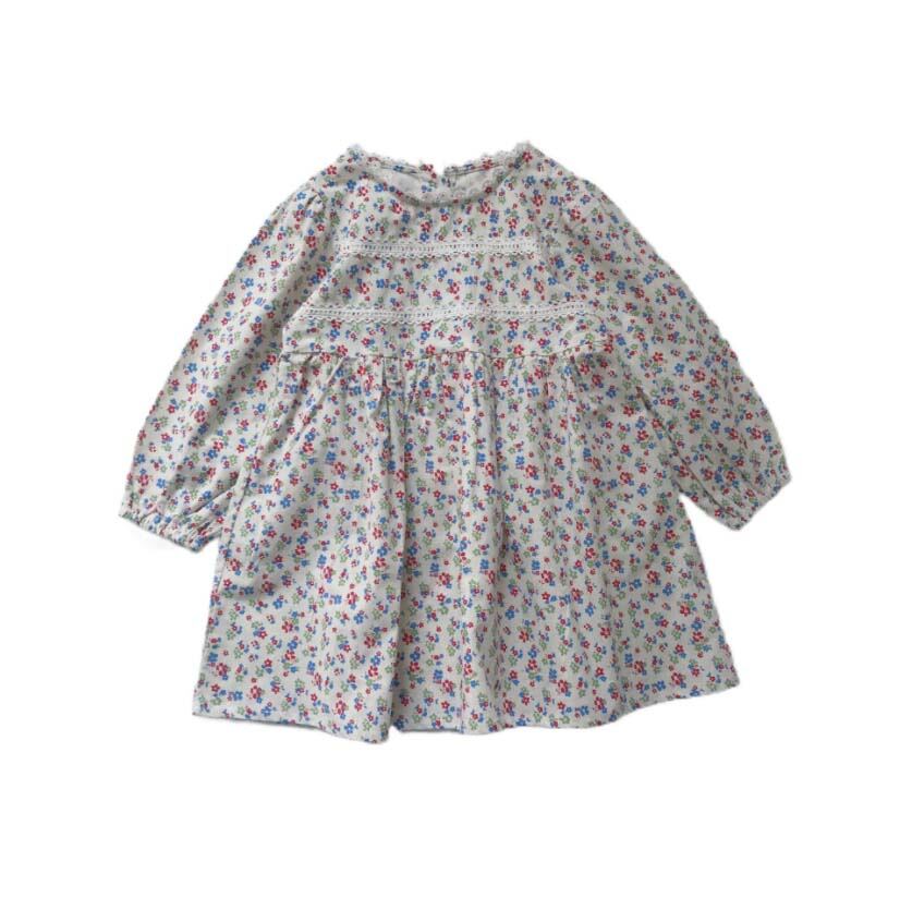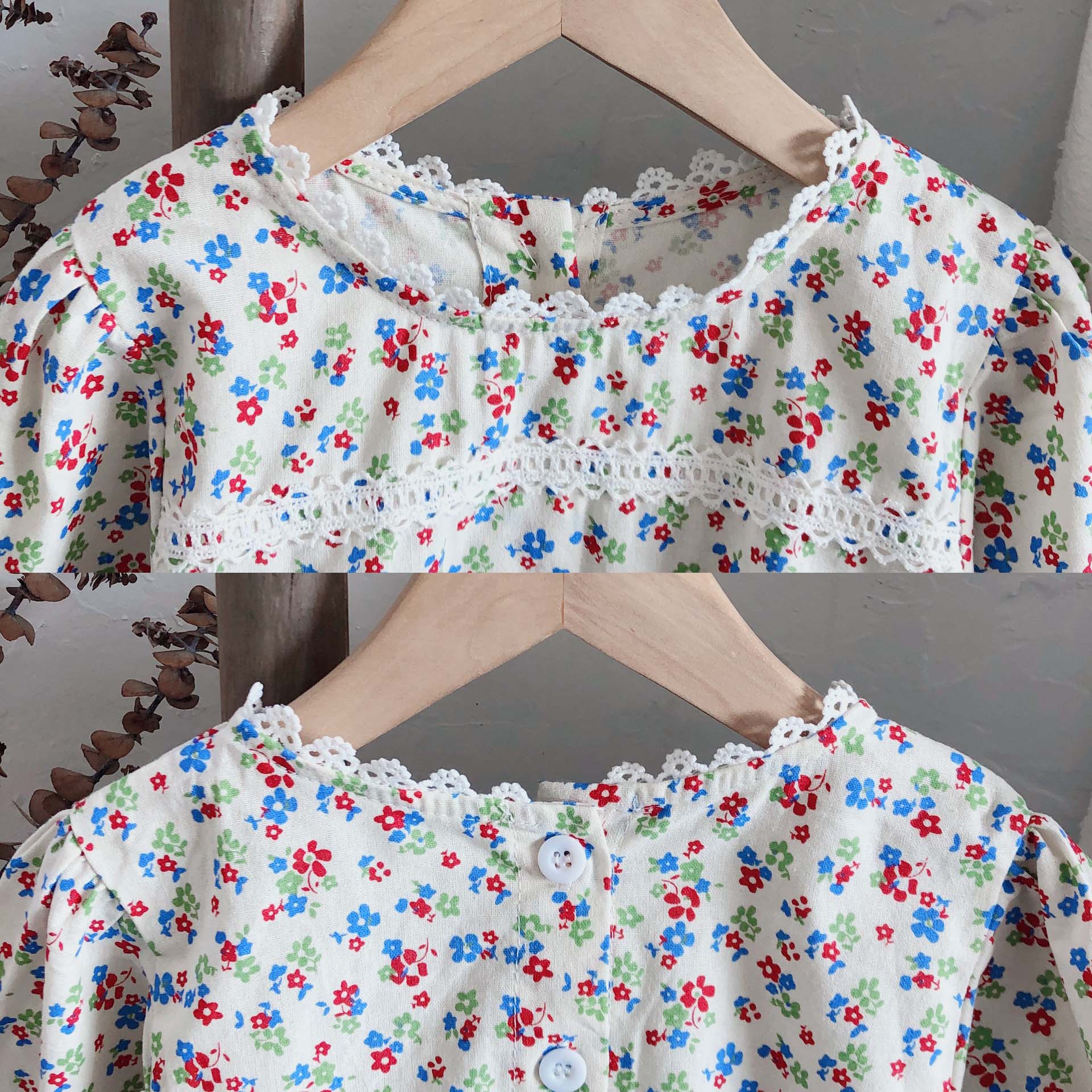 ◇首元、胸元にレースフリルが付いてかわいい、白をベースに赤、緑、青の花柄が元気でポップなイメージのワンピースです。