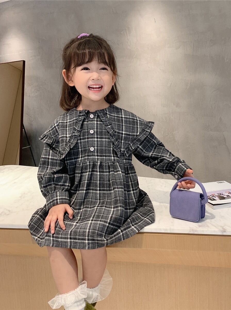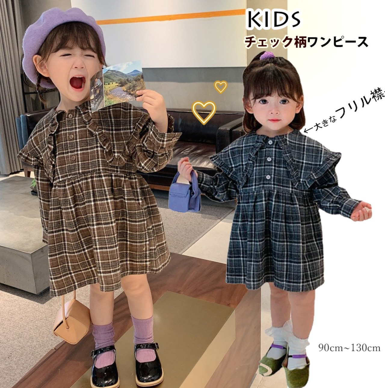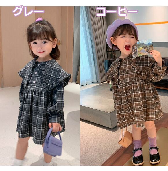 【海外からの取り寄せ】2021春夏新作 韓国風 子供服 女の子 可愛いキッズ チェック柄 ビッグ襟 ビッグカラー ワンピース ドレス #[kids207_11800]【送料込み】【250327】