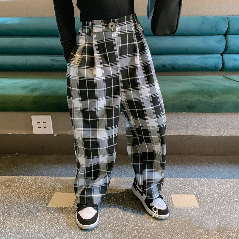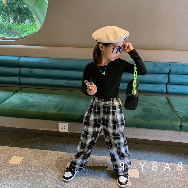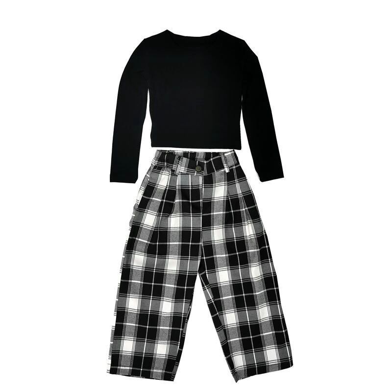 ベーシックトップスとチェック柄ワイドパンツの2点セット