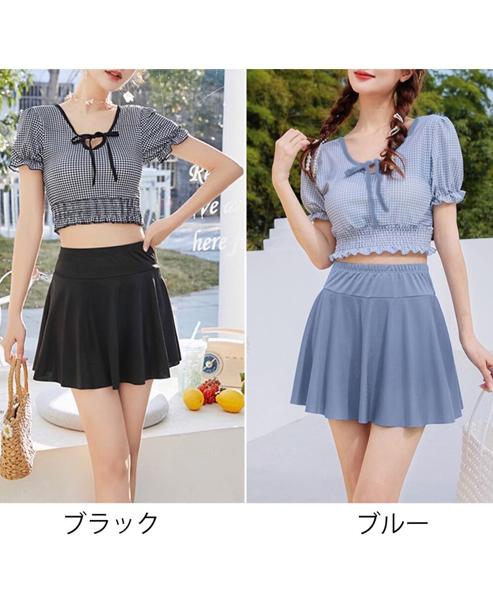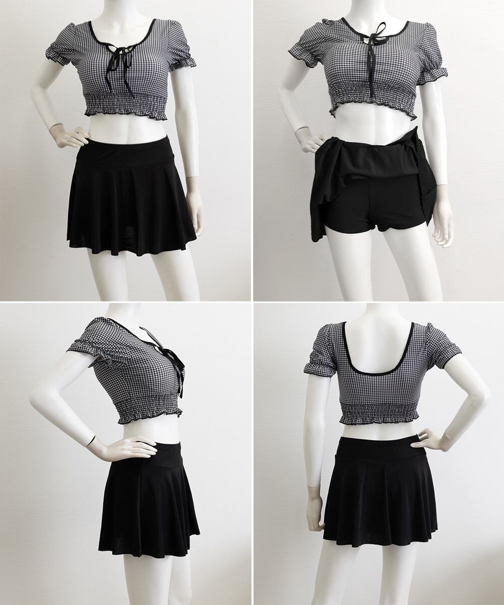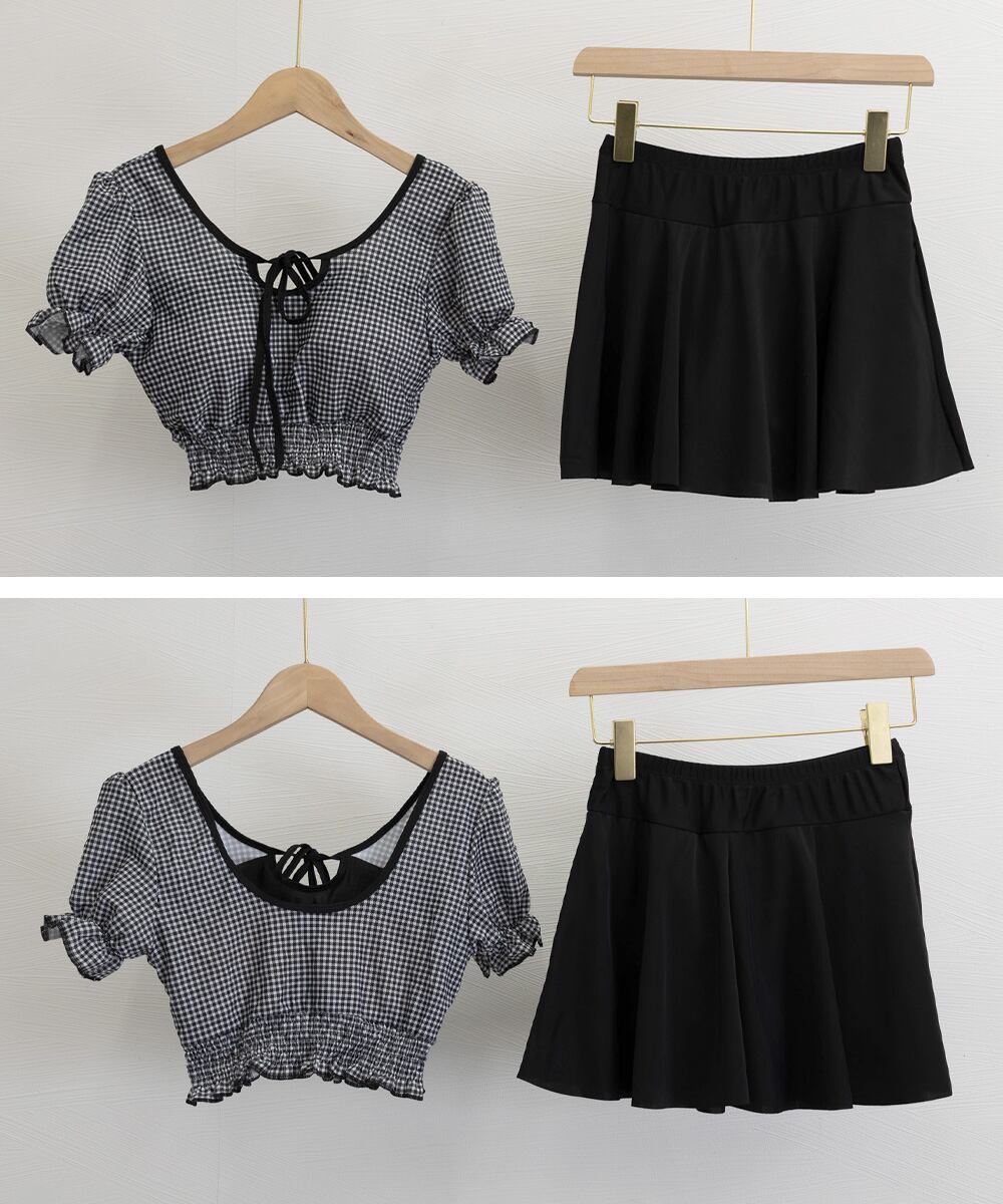 ガーリーで可愛らしいクロップド丈のチェック柄トップスとシンプルなフレアスカートの2点セットの水着