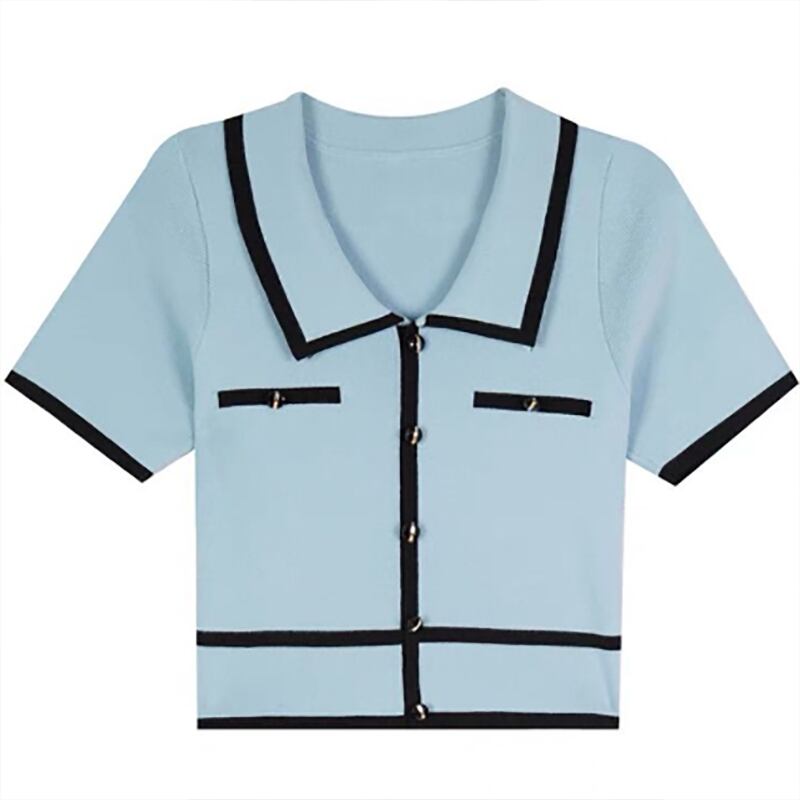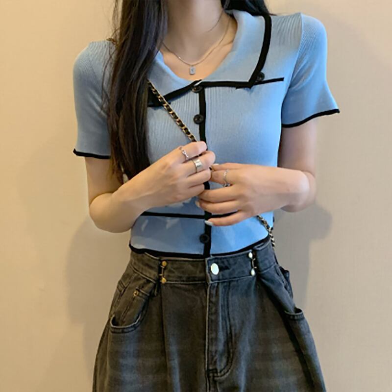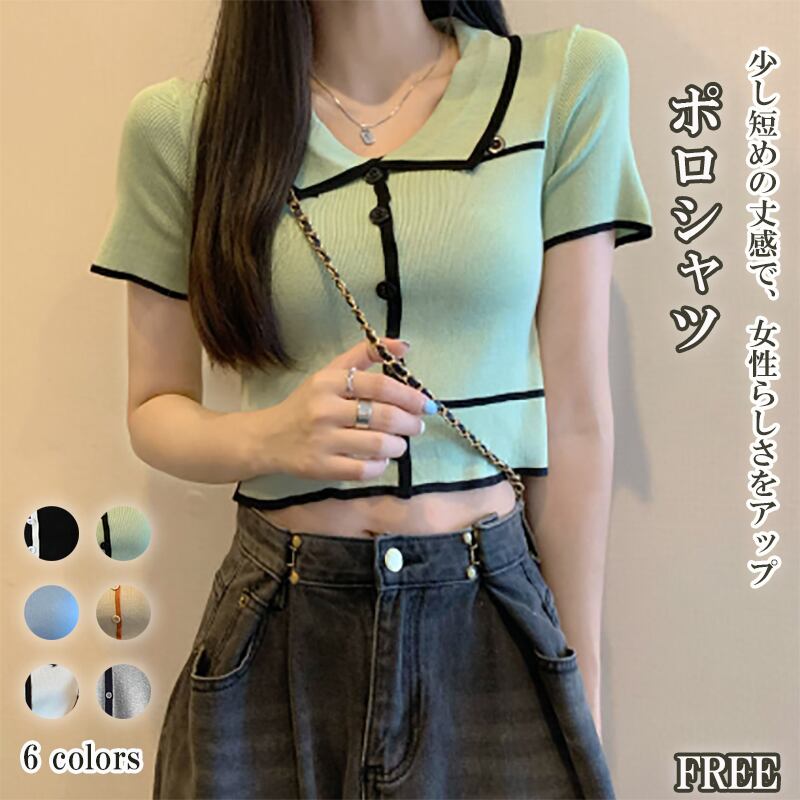 【海外からの取り寄せ】 2025新作 レディース 配色ラインリブボタン 襟付きニット 半袖 トップス ポロシャツ #[shirt461_9800]【送料込み】【250711】