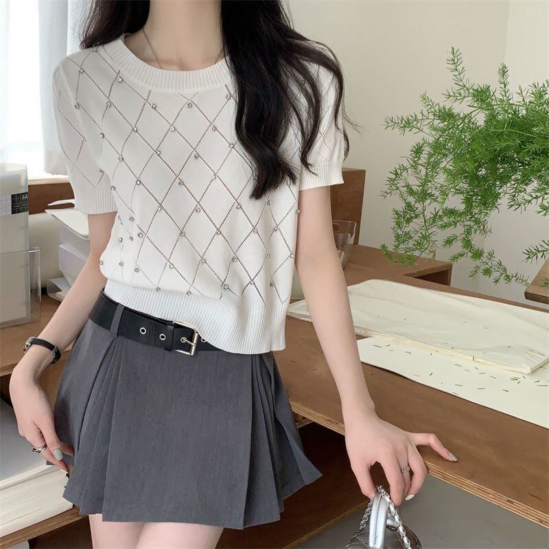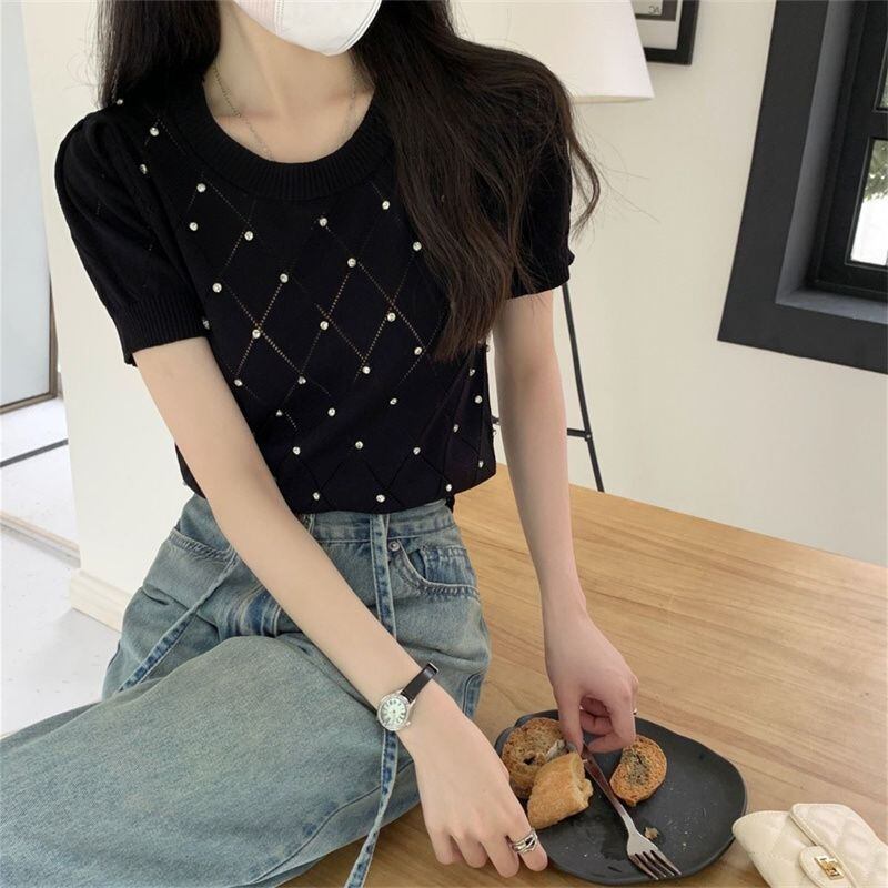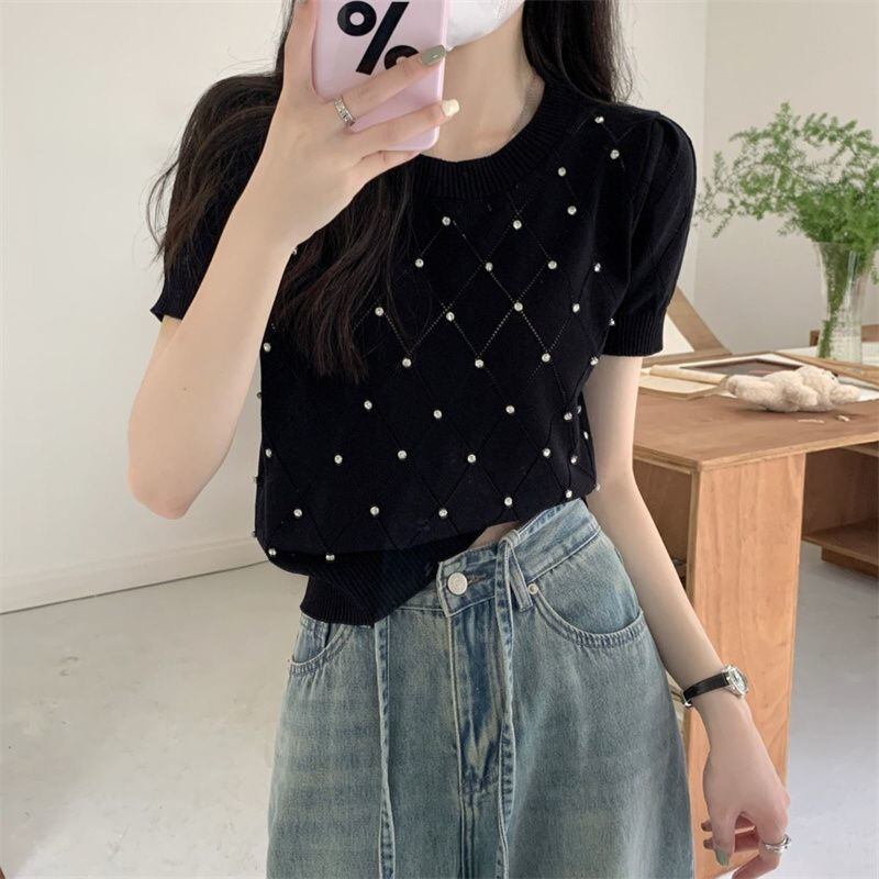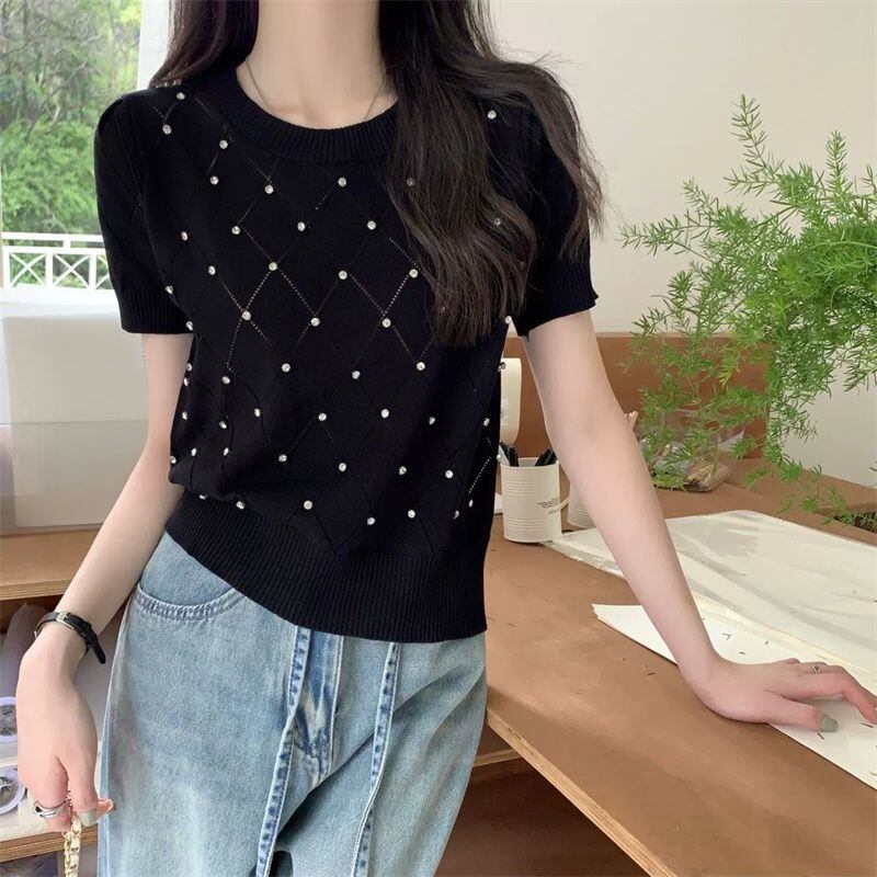 【海外からの取り寄せ】 2025新作 レディース ラウンドネック ラインストーン付き 半袖ニット トップス #[tops589_10800]【送料込み】【250704】