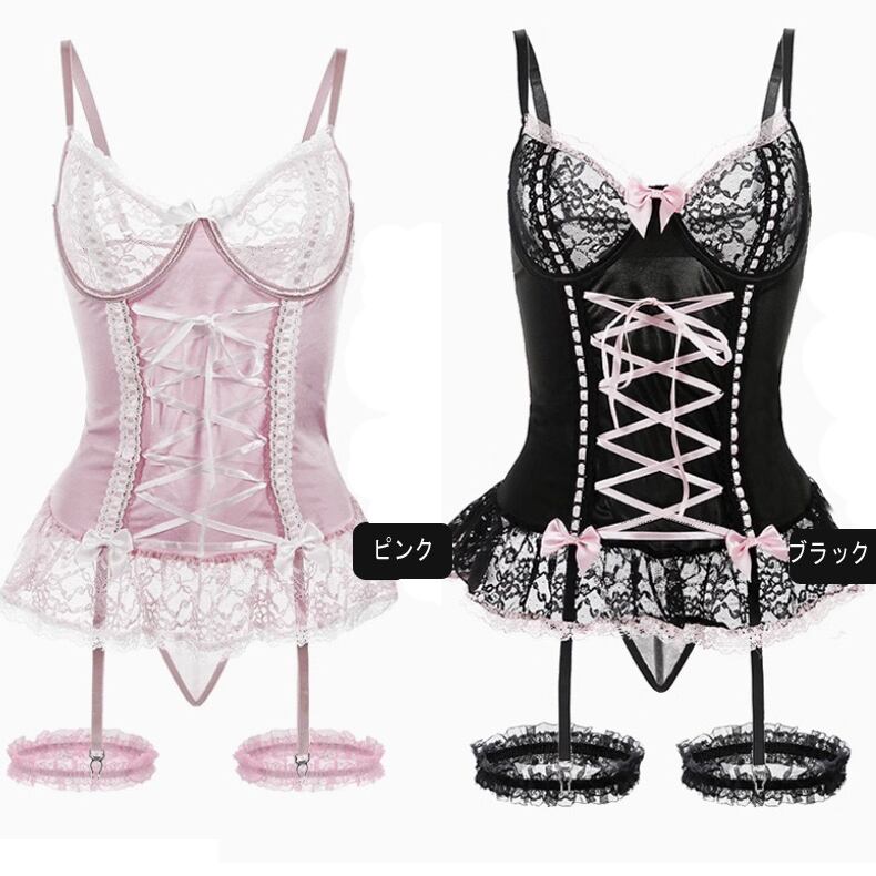 ガーターベルト一体型ビスチェ、Tバックショーツ、ガーターリング×2