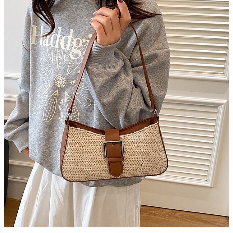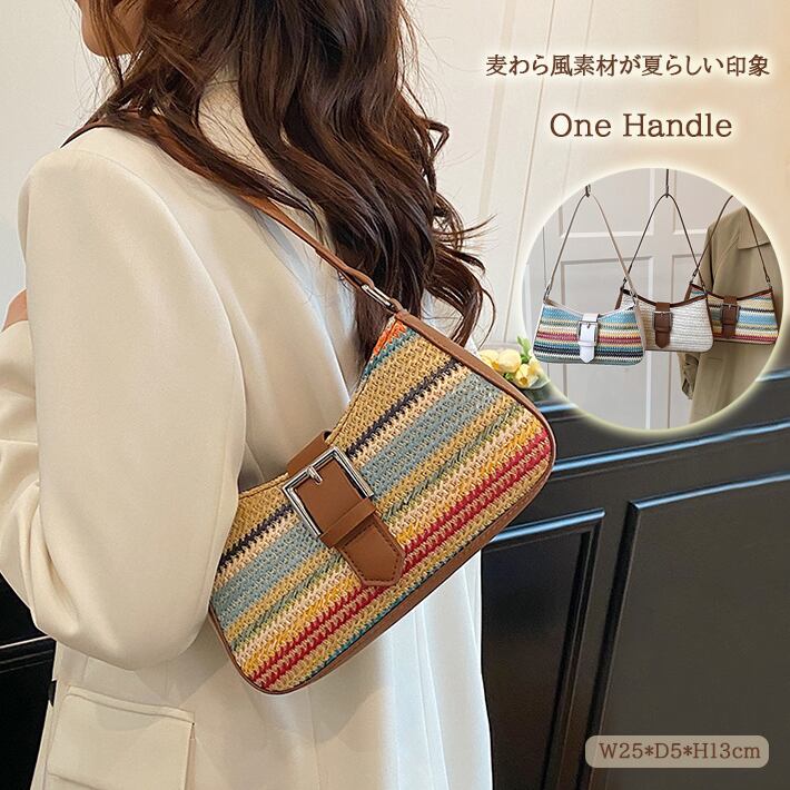 ・麦わら風素材夏らしい印象を与えるワンハンドルショルダーバッグ。