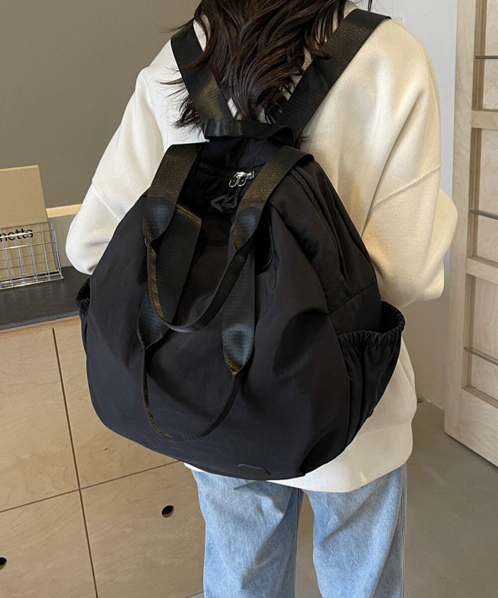両サイドには便利なゴム付きポケットがあり、水筒や折りたたみ傘の収納に最適