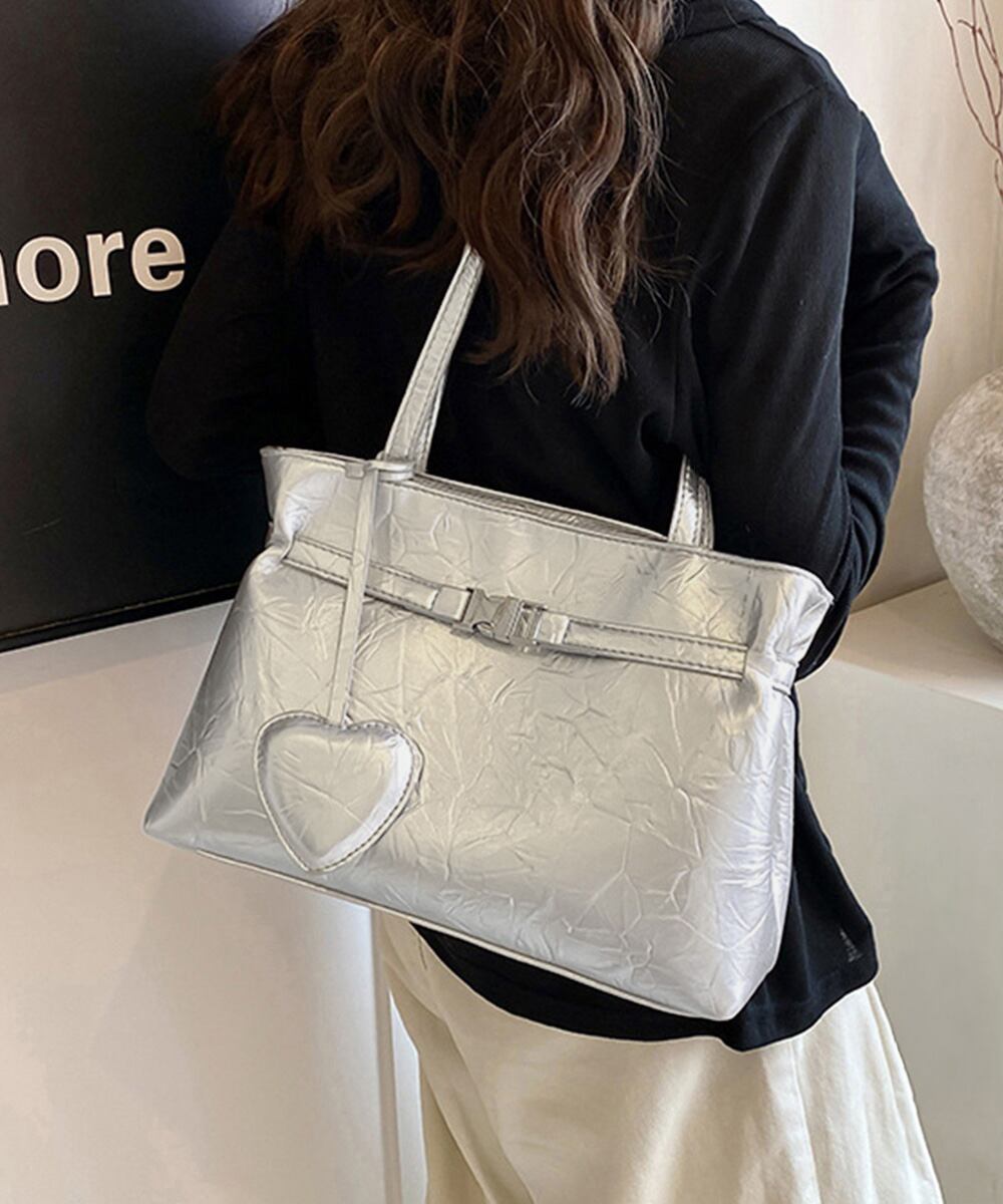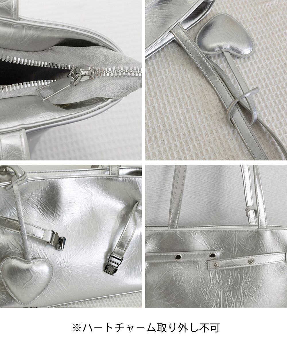 ハート型のチャームが魅力的な、洗練された輝きを放つメタリックトートバッグ