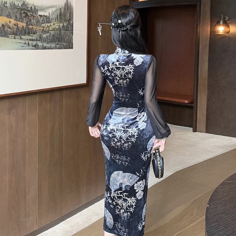 ネックのデザインが特徴的なセクシー紺地の花柄チャイナドレス♪光沢感あり、高級感が溢れるベロア風生地の上質な大人のドレス!!脚魅せのハイスリットがセクシー◎すけすけレースの袖も魅力的♪着心地がいい、ストレッチも効いて楽ちん。ボディラインを美しく見せる大変綺麗なドレスです。