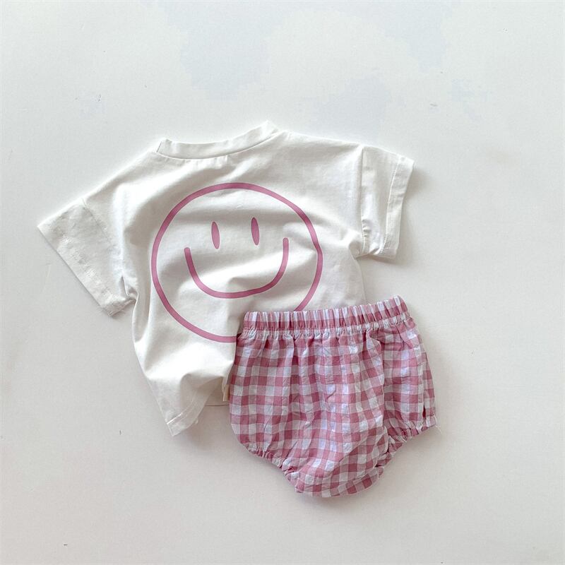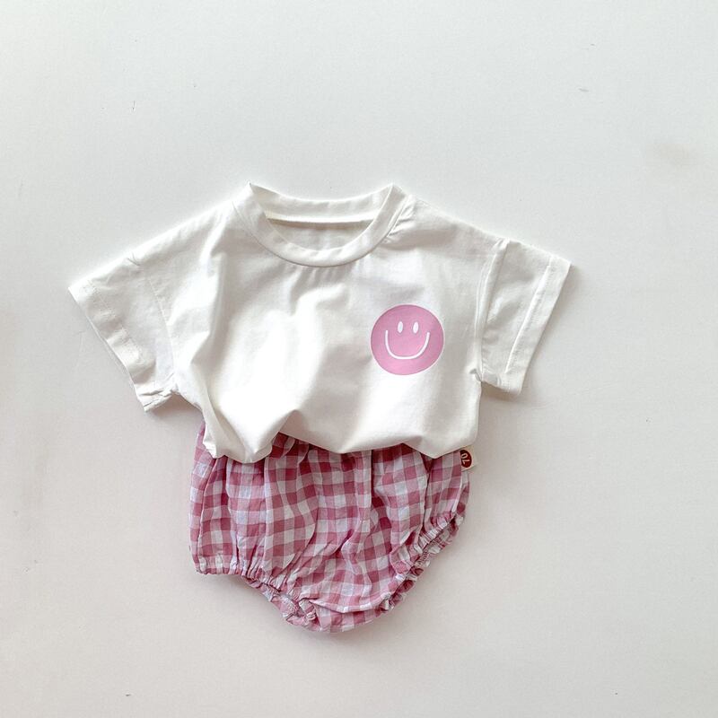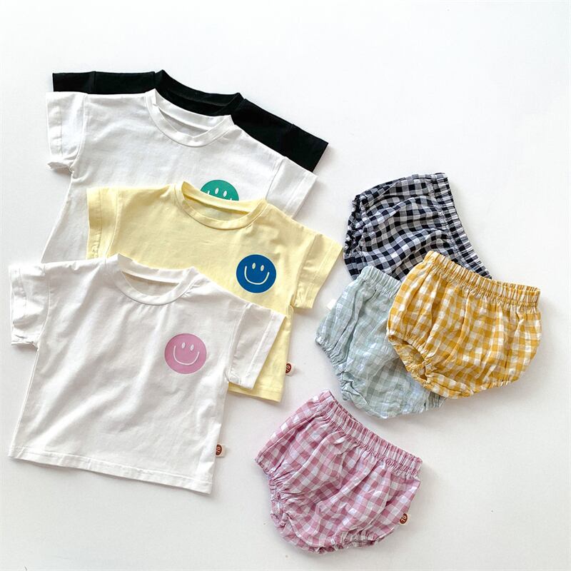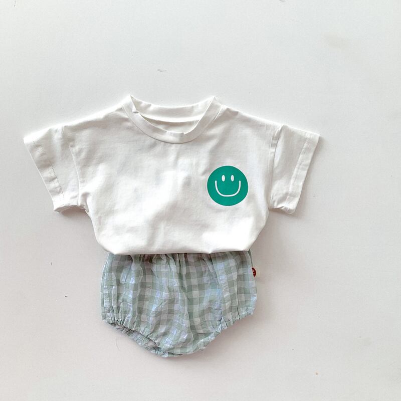 【海外からの取り寄せ】ins 夏新作 赤ちゃん 笑顔 セットアップ 半袖Tシャツ 格子ショートパンツ 子供服 可愛い 柔らかい #[ckd1093782_10800]【送料込み】【250517】