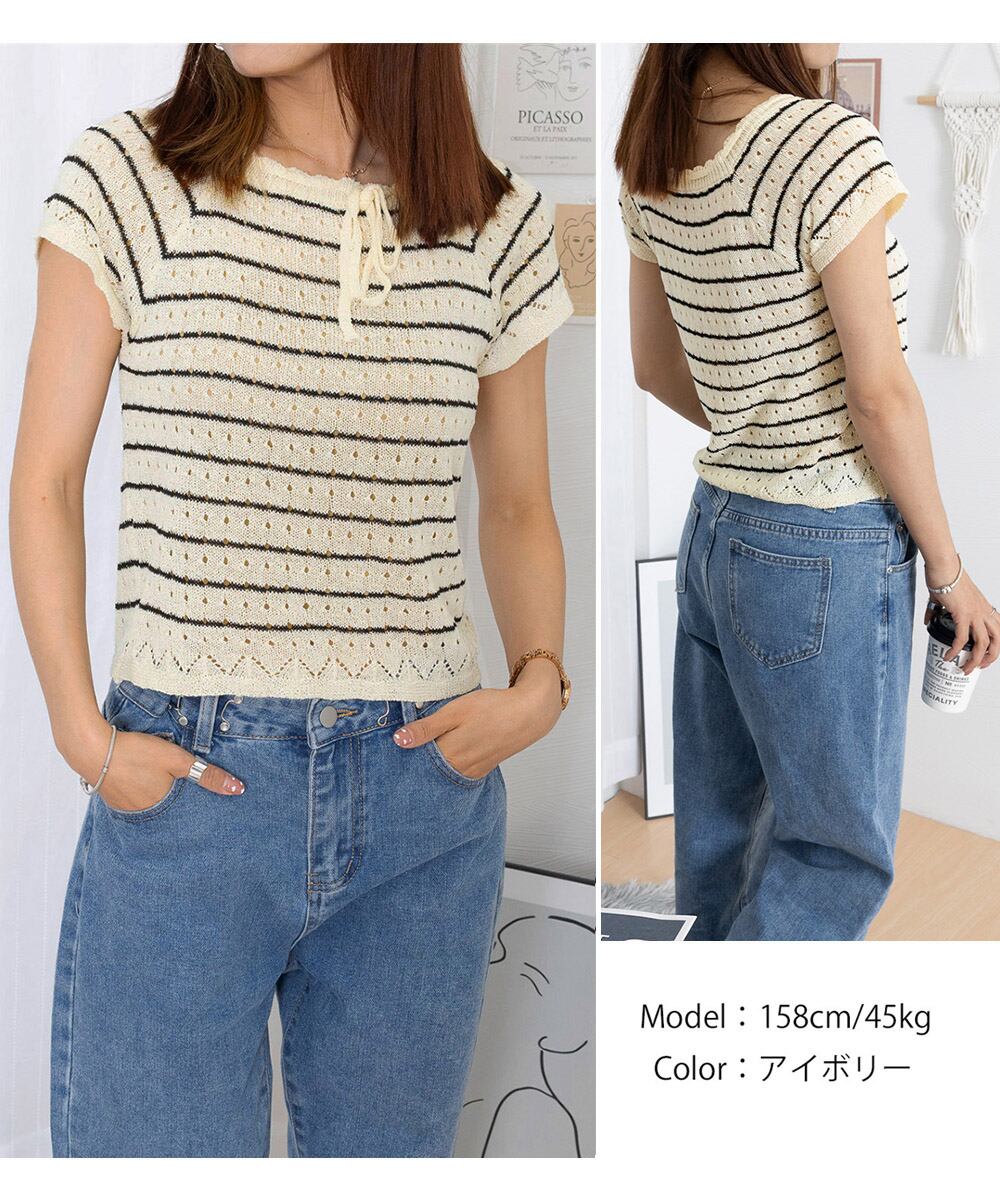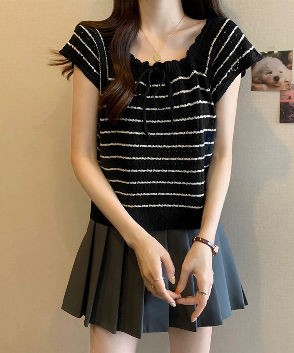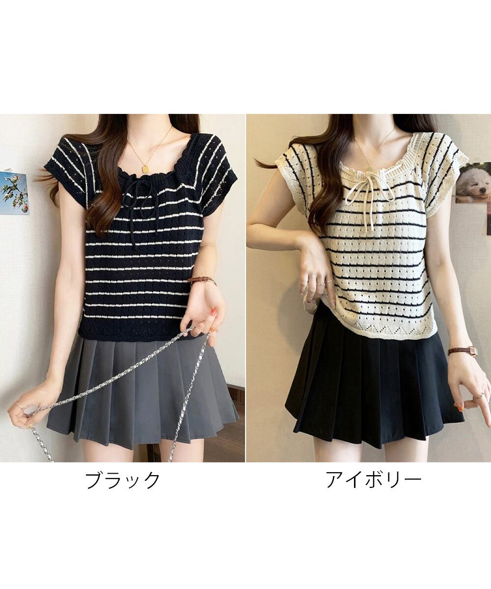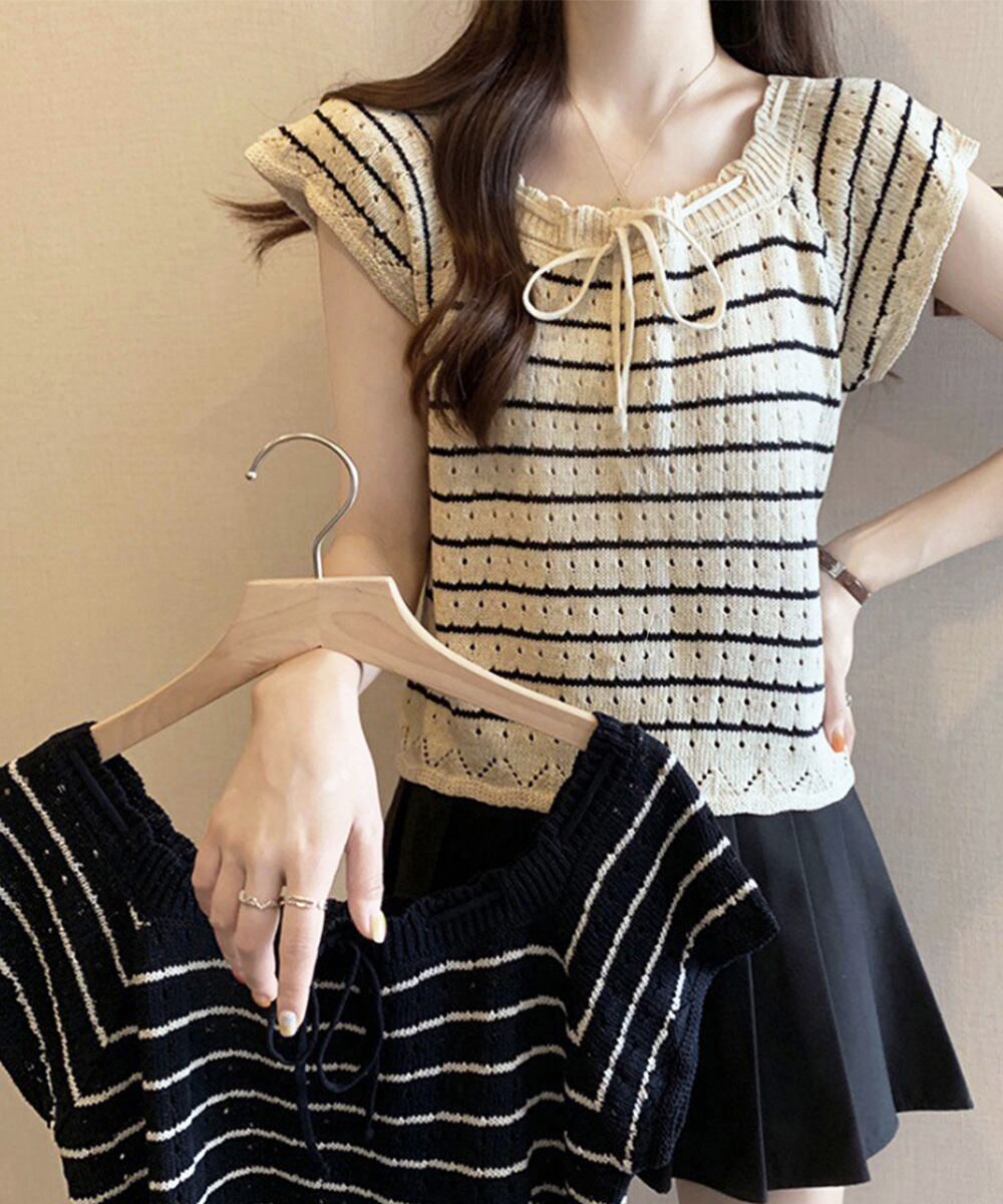 【日本倉庫からの発送】 パンチングリボン半袖ニットトップス韓国風 #[90CHENXINI-012_14800]【送料込み】【250712】