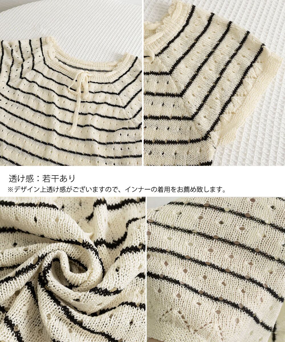 ボーダー柄サマーニット レディース ニットソー 薄手ニットTシャツ 大人可愛い ガーリーニットプルオーバー おしゃれ夏服