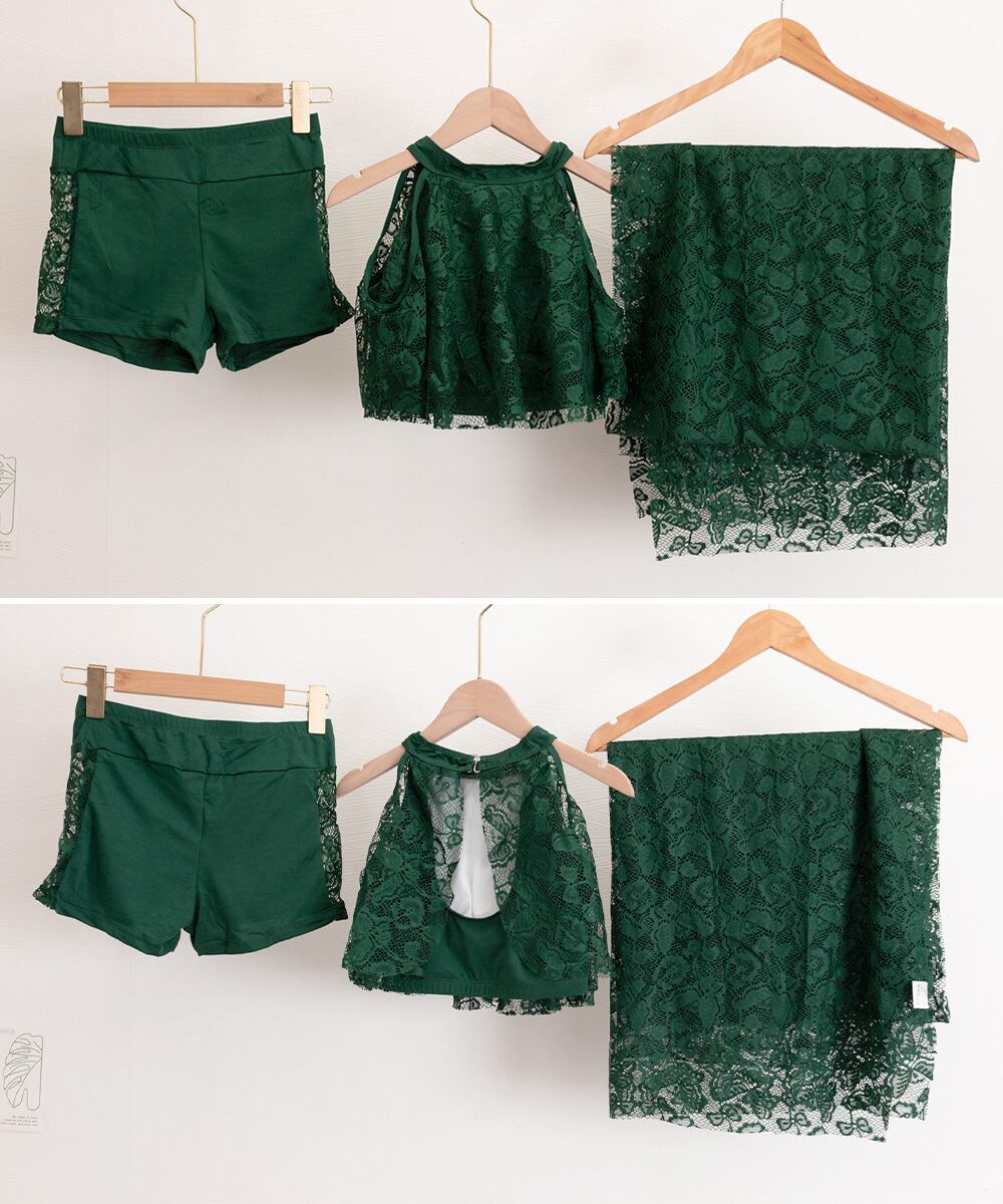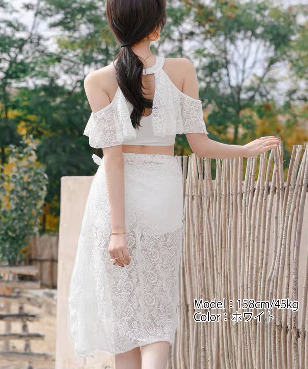 レース素材のロングパレオ付きで、体型を美しくカバーしながら上品な印象に。