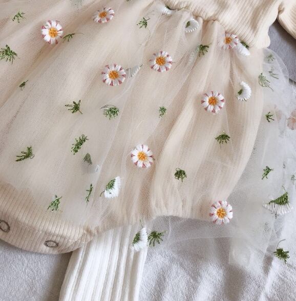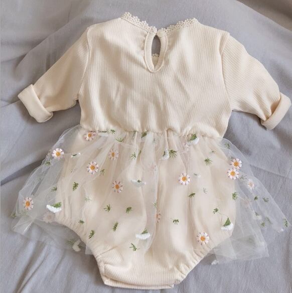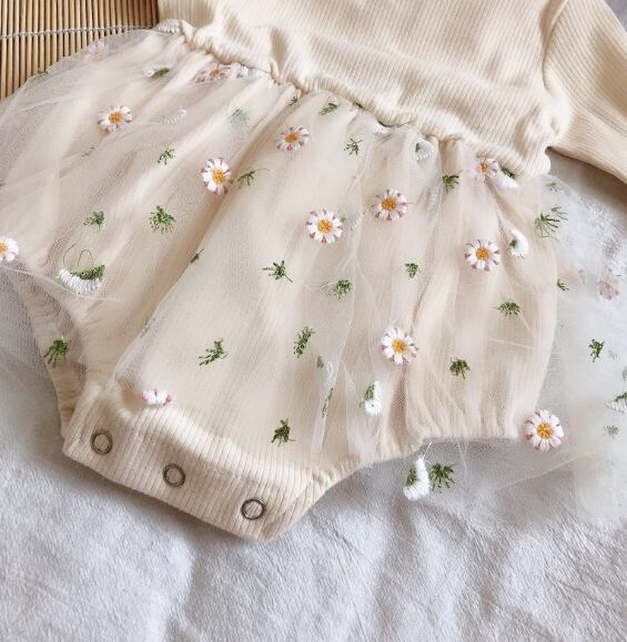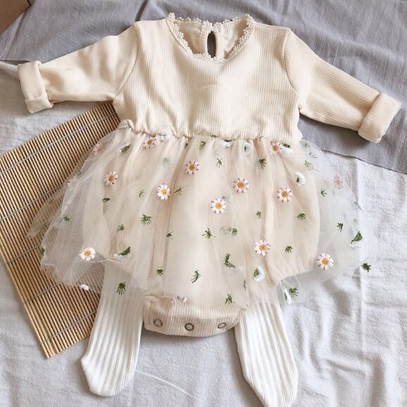 【海外からの取り寄せ】ベビーロンパース 秋 ニット 女の子 重ね着 子供 ロンパース 花付き チュール 刺繍 66-90 #[ckd101048_15500]【送料込み】【250503】