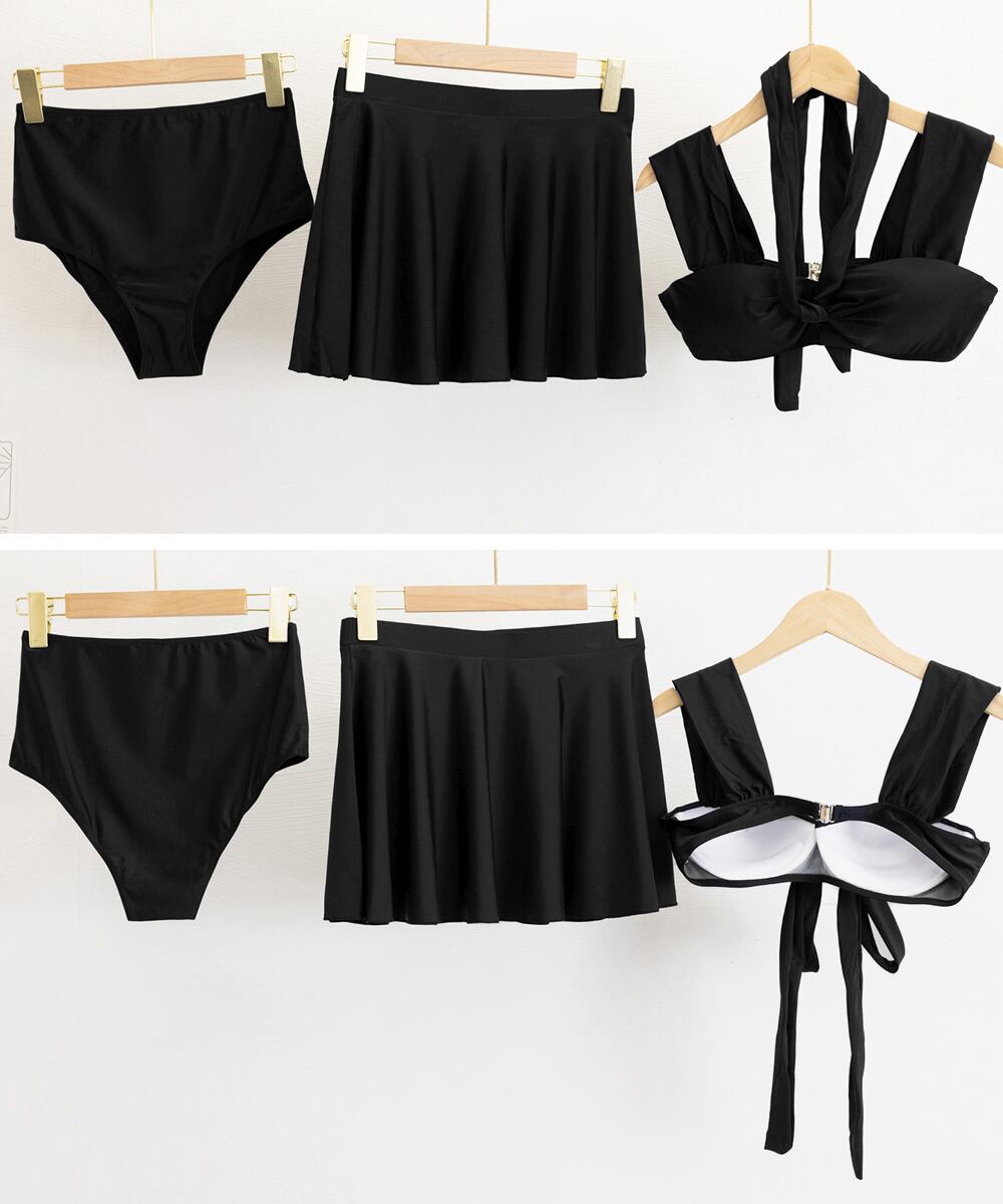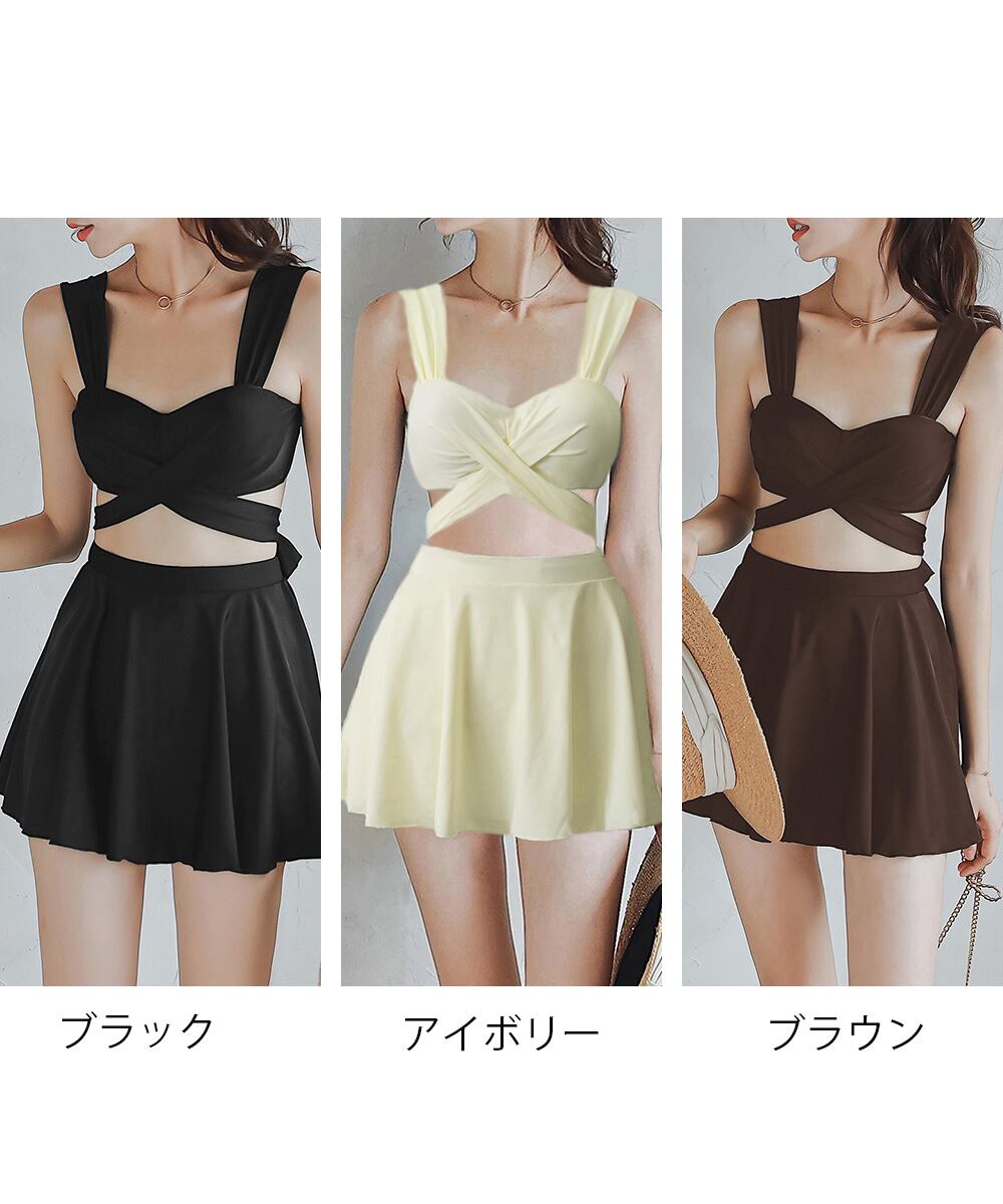 レディース セクシークロスバンドゥビキニ ハイウエストフリルミニスカート水着セット バッグリボンスイムウェア 体型カバー