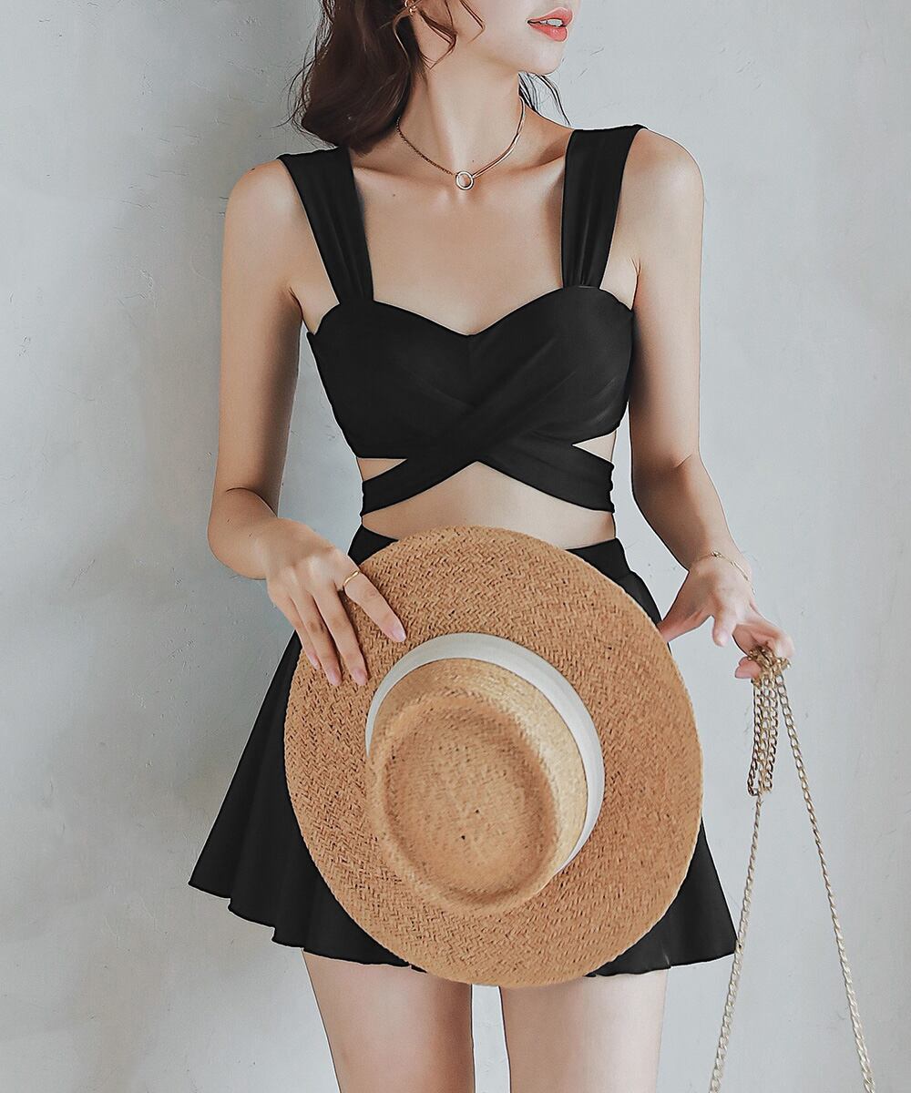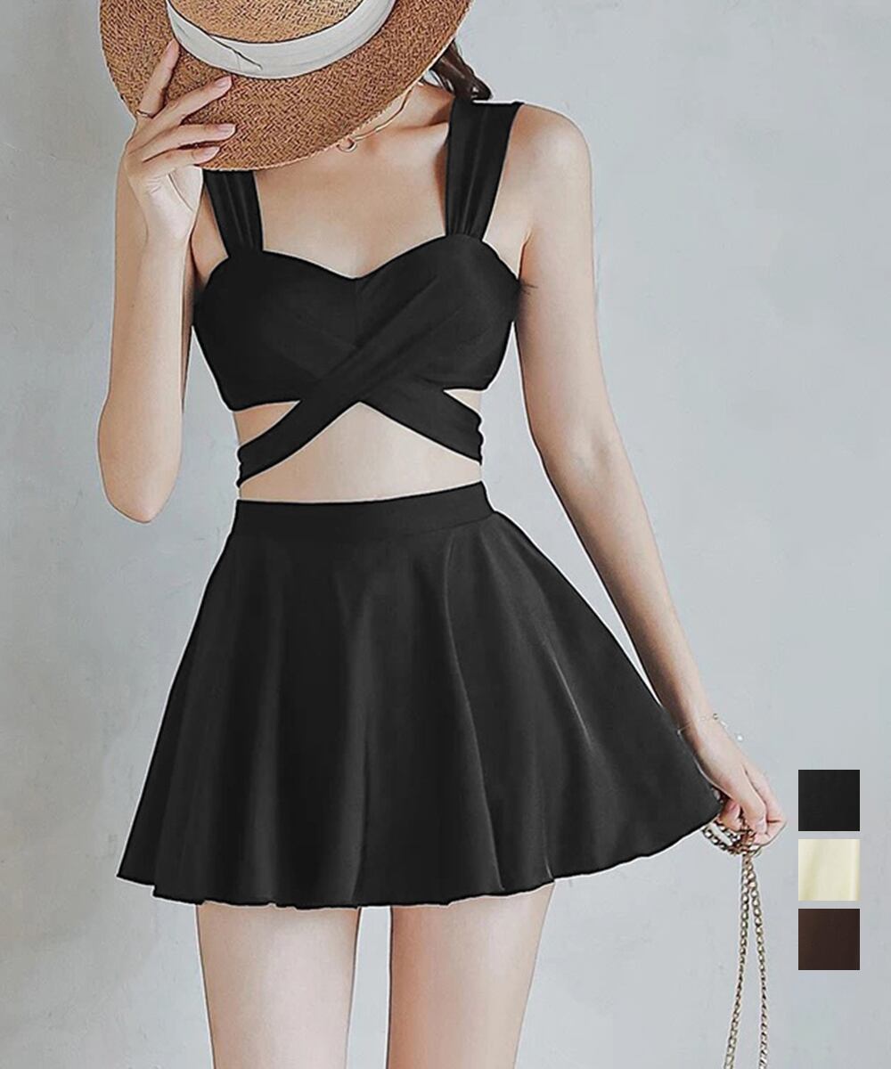 目を惹くセクシーなクロスデザインの水着3点セット。