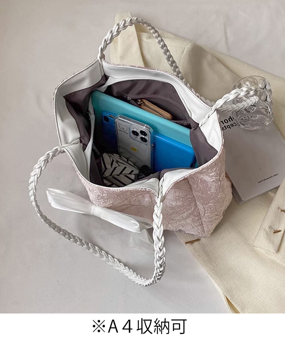 上品な光沢感と立体感のある生地が魅力のリボントートバッグ。