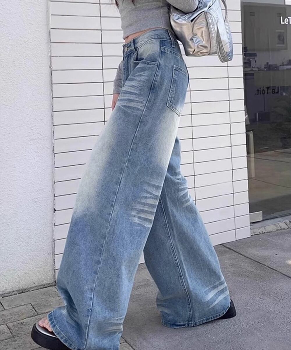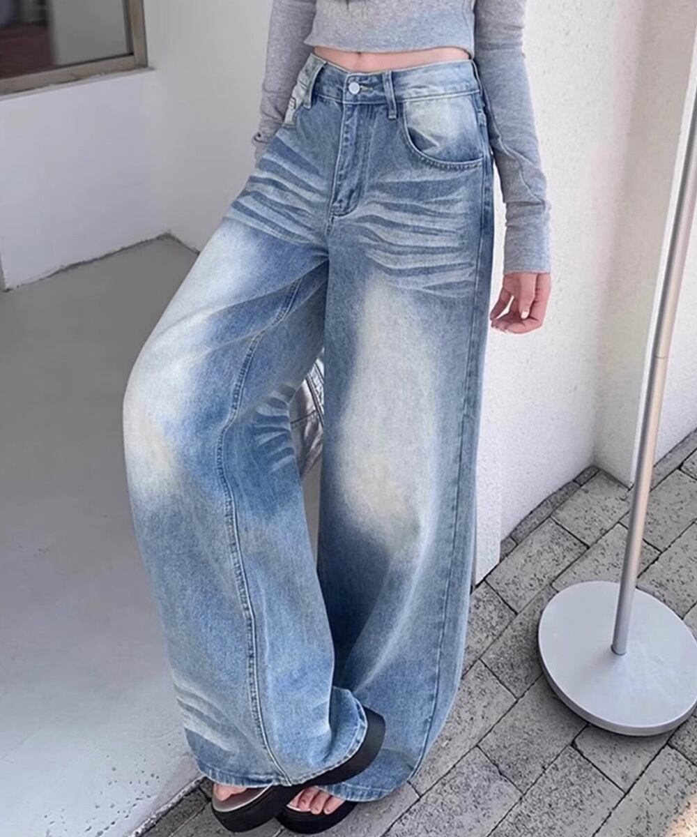 ジーンズ ゆったりシルエット ウォッシュデニム 美脚脚長ワイドパンツフルレングスジーパン 韓国ファッション着やせボトムス