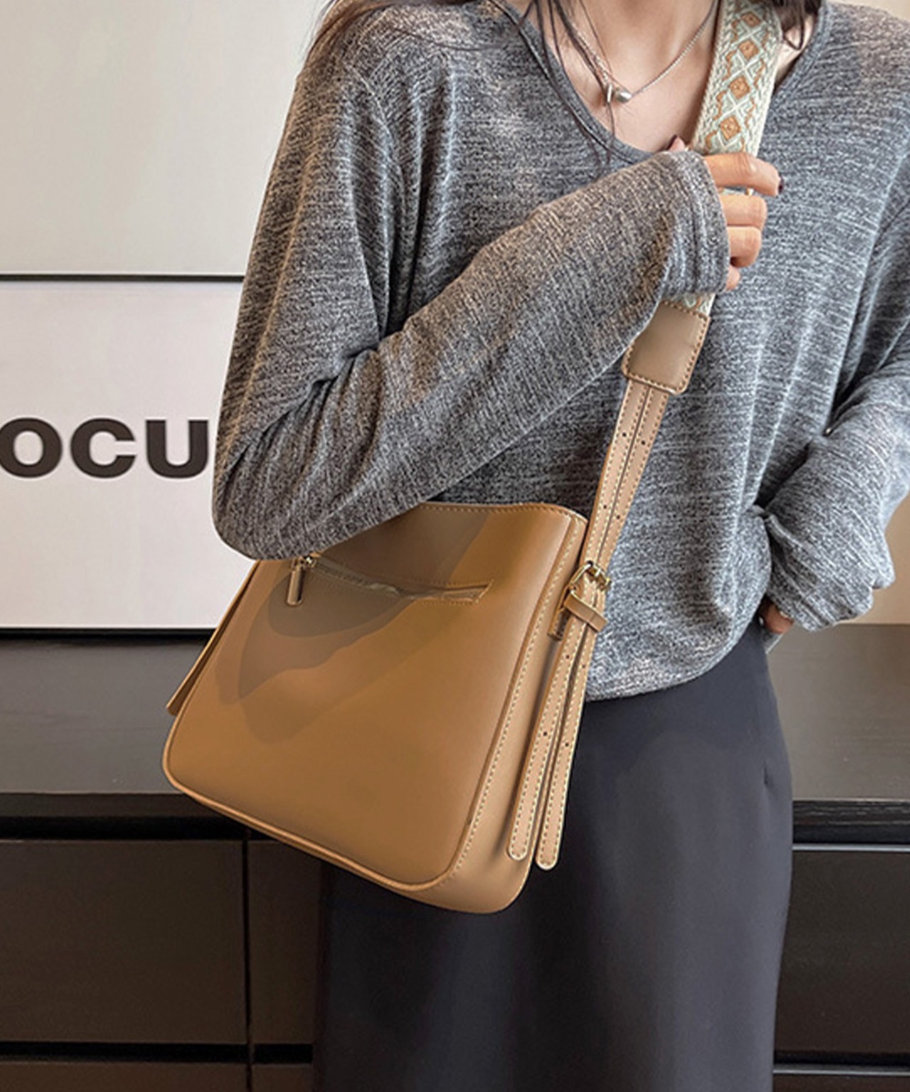 ショルダーベルトは長さ調節ができ、肩掛けも斜め掛けも楽しめる