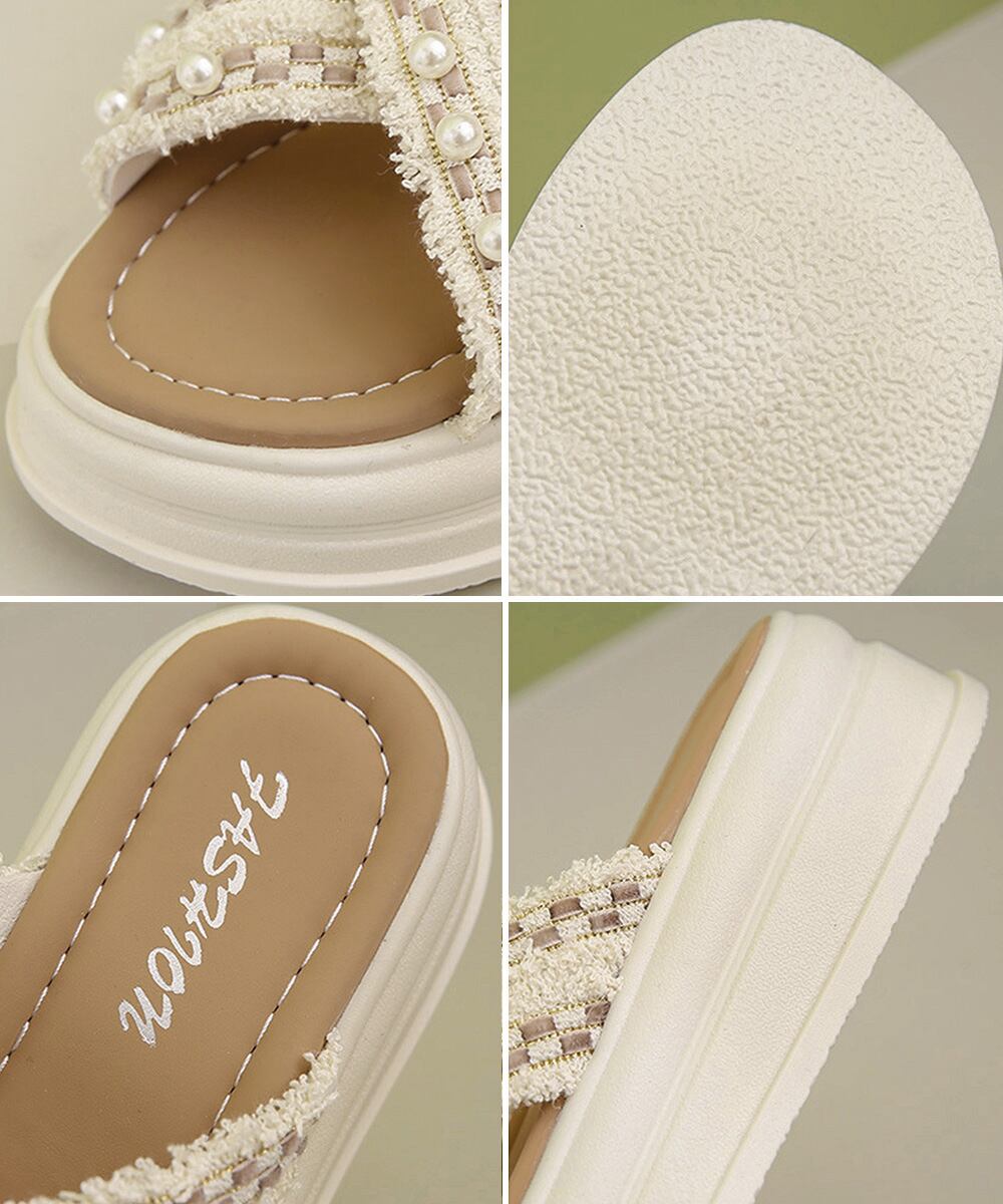 レディース ツイードサマーサンダル 美脚 歩きやすいビーチサンダル 大人可愛い夏靴 履きやすい 真珠付きサンダルおしゃれ