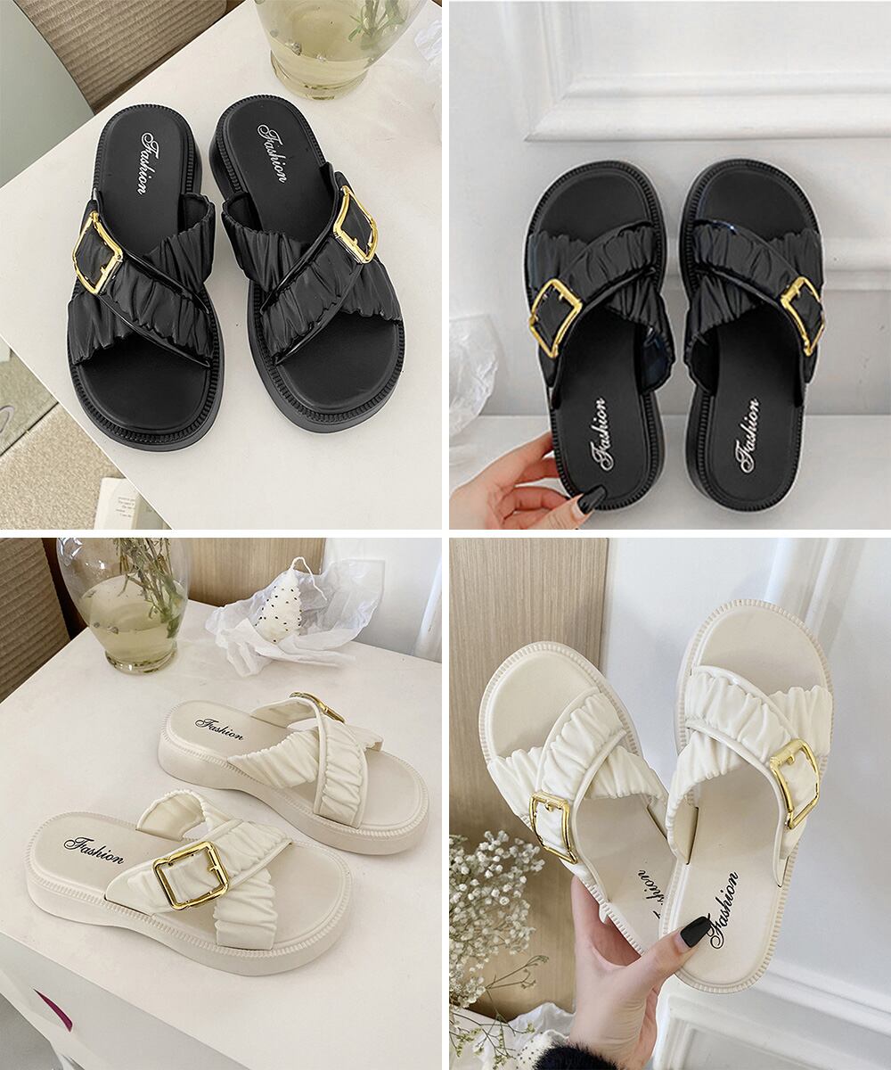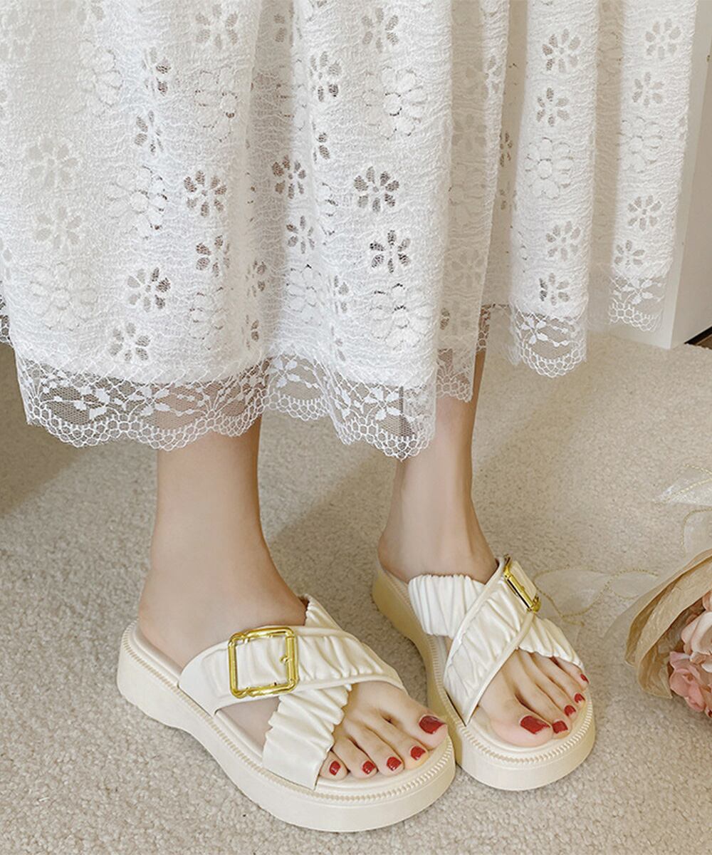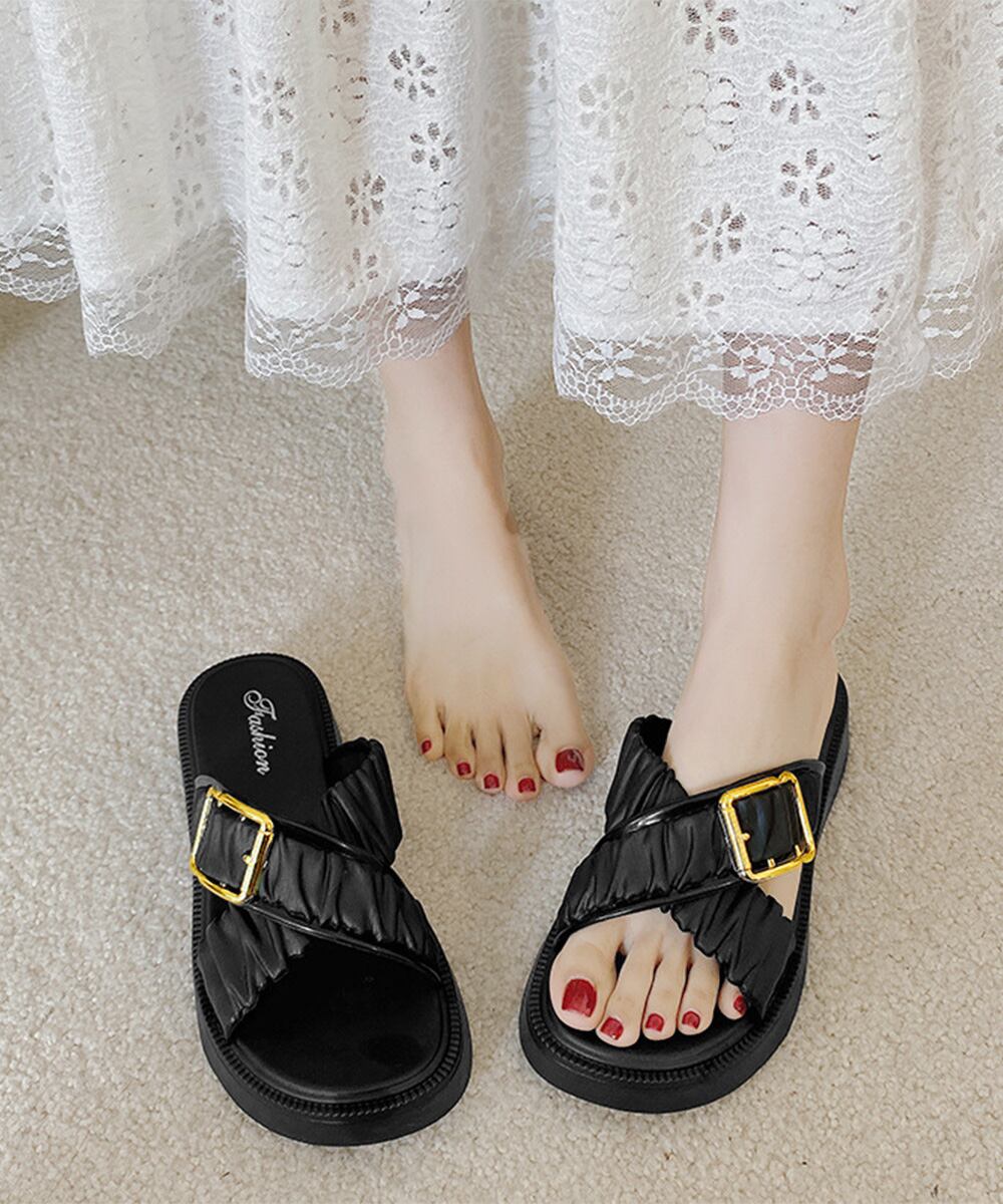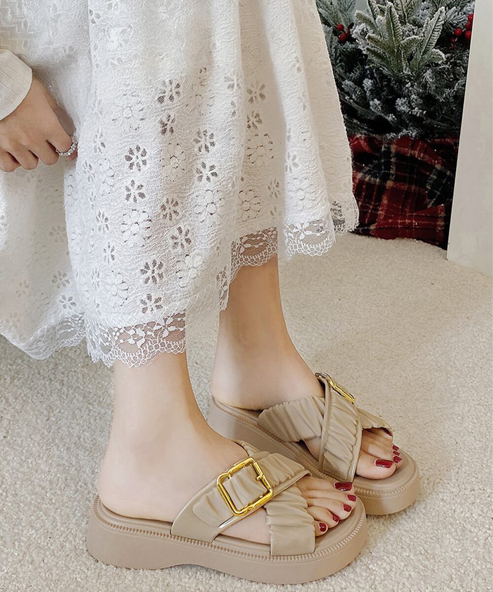 ギャザーベルトにゴールドバックルをあしらった、可愛くておしゃれ度満点のサンダル