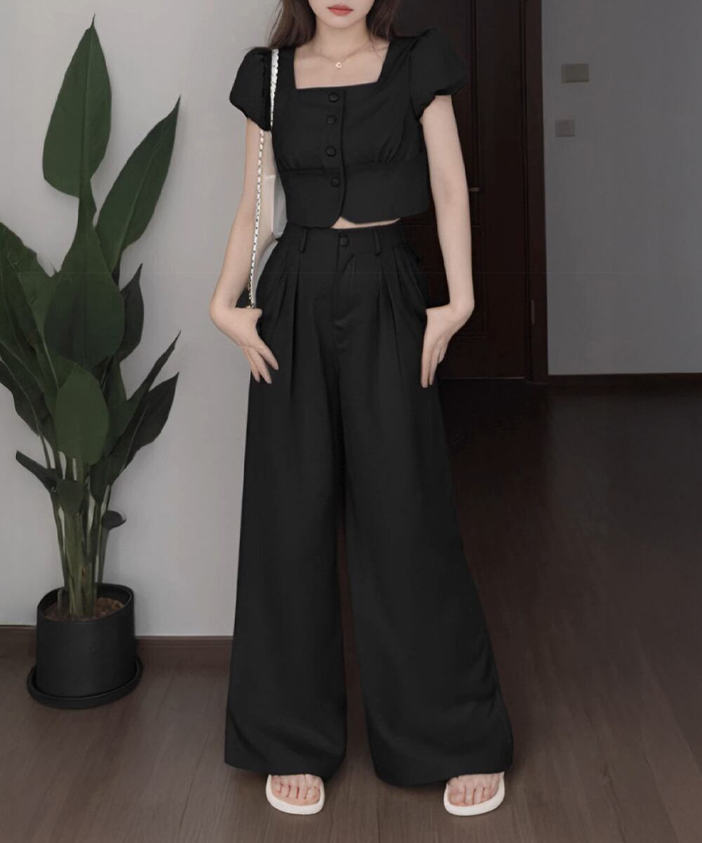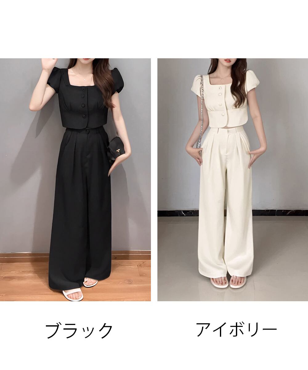 半袖のスクエアネックトップスとタック入りのロングパンツがセットになった、おしゃれな上下2点セットアップ