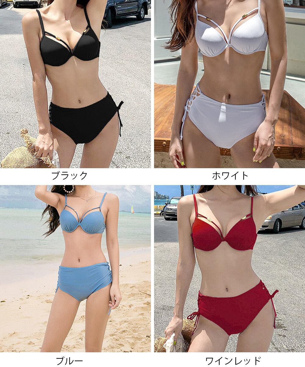 美胸スイムウェア ワイヤー入り 胸ラインビキニ サイドレースアップショーツ 上下2点セット 着やせ 盛れる水着 大人女子