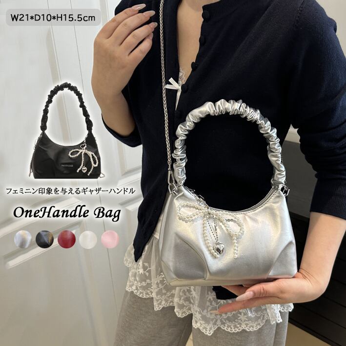 ・フェミニン印象を与えるギャザーハンドルのワンハンドルバッグ。