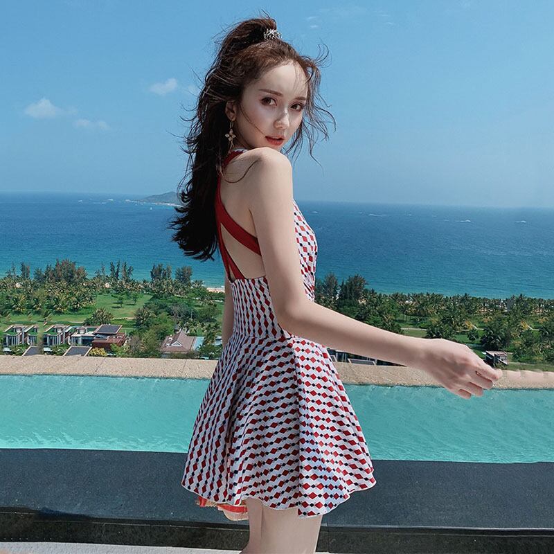 【海外からの取り寄せ】2022新作 レディース 水着 ワンピース ダイヤ柄 バッククロスストラップ 赤 レッド かわいい スカート #[cv105_11800]【送料込み】【250524】