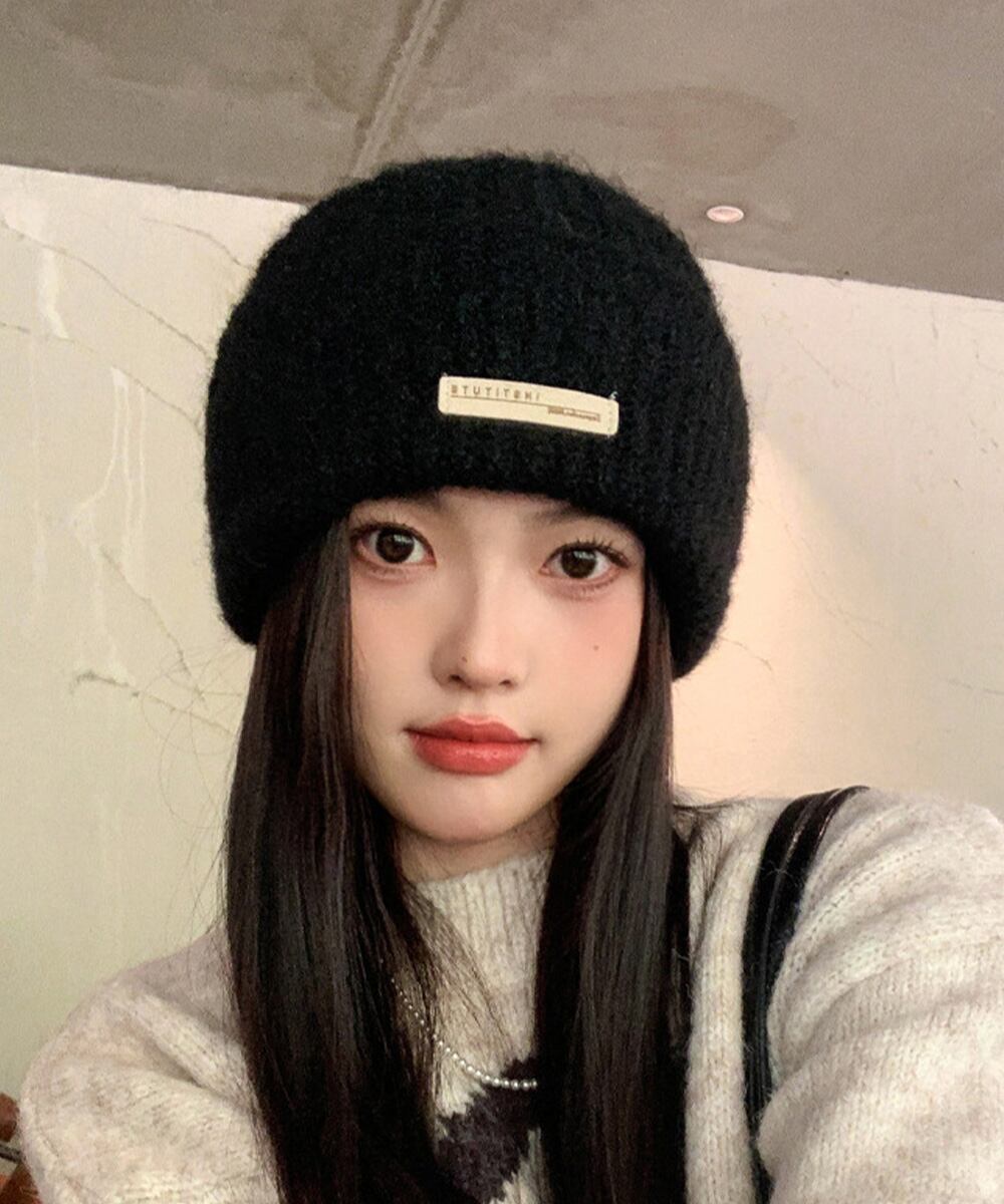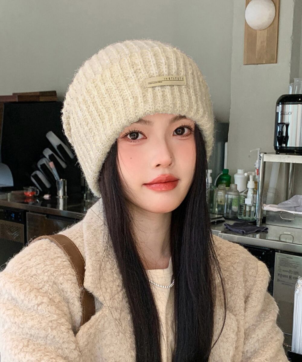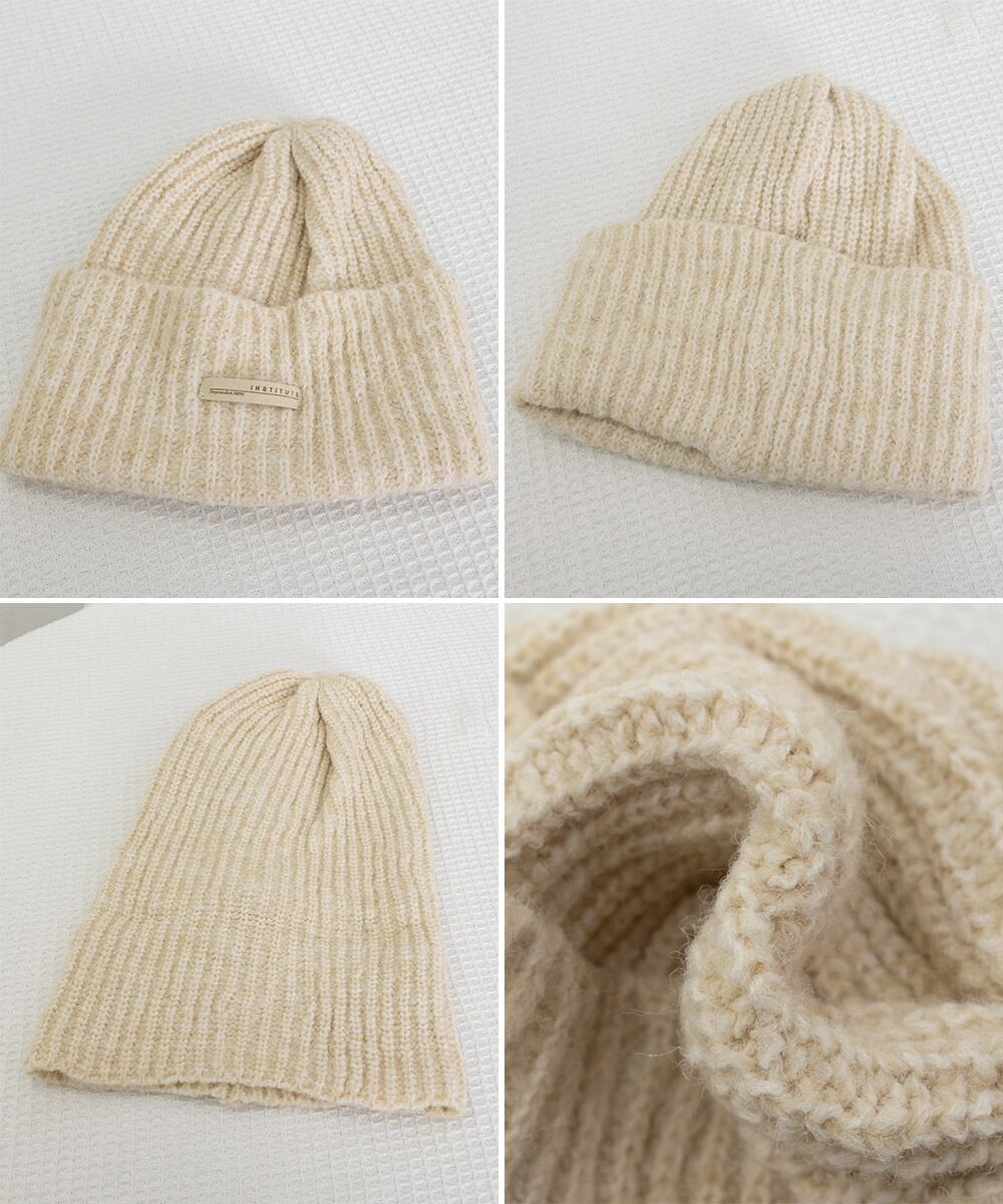 折り返しニットキャップ リブ編み ロゴ付きぼうし あったか 韓国ファッショ小物 ニットキャップ お出掛け 防寒ぼうし秋冬