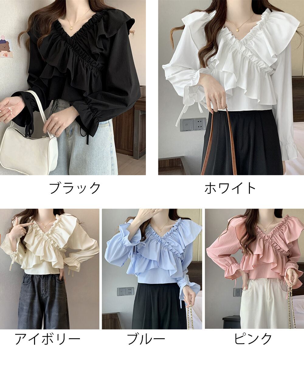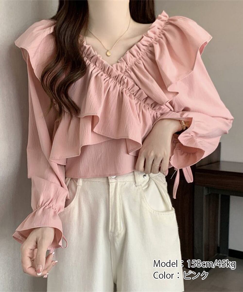 レディース マルチウェイ リボンショート丈ブラウス 韓国風大人可愛い Vネック薄手ブラウス着やせフェミニン クロスフリル