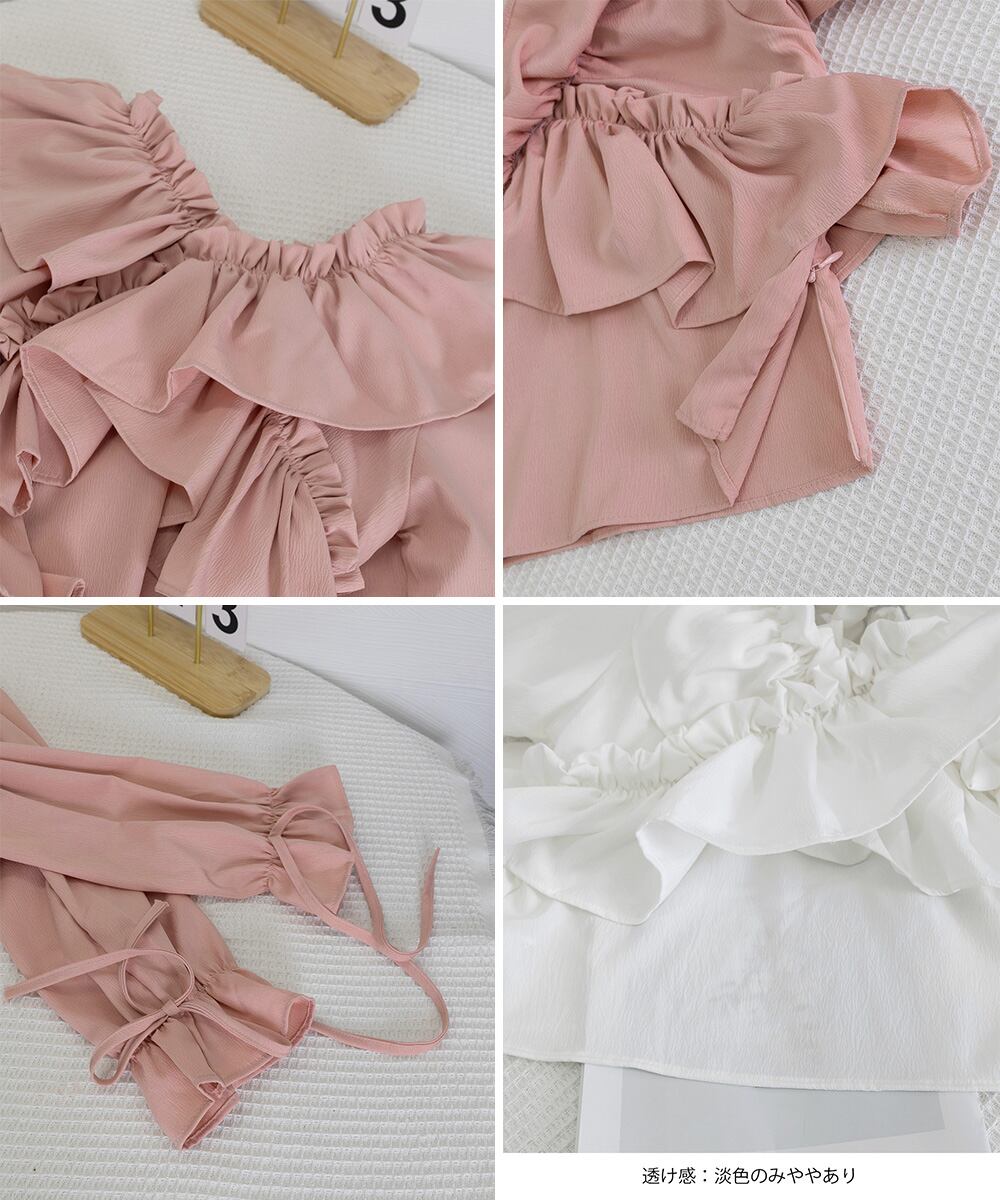 Vネックでデコルテを美しく見せ、肩のフリルを落とすとオフショルダーでも着られる2way仕様