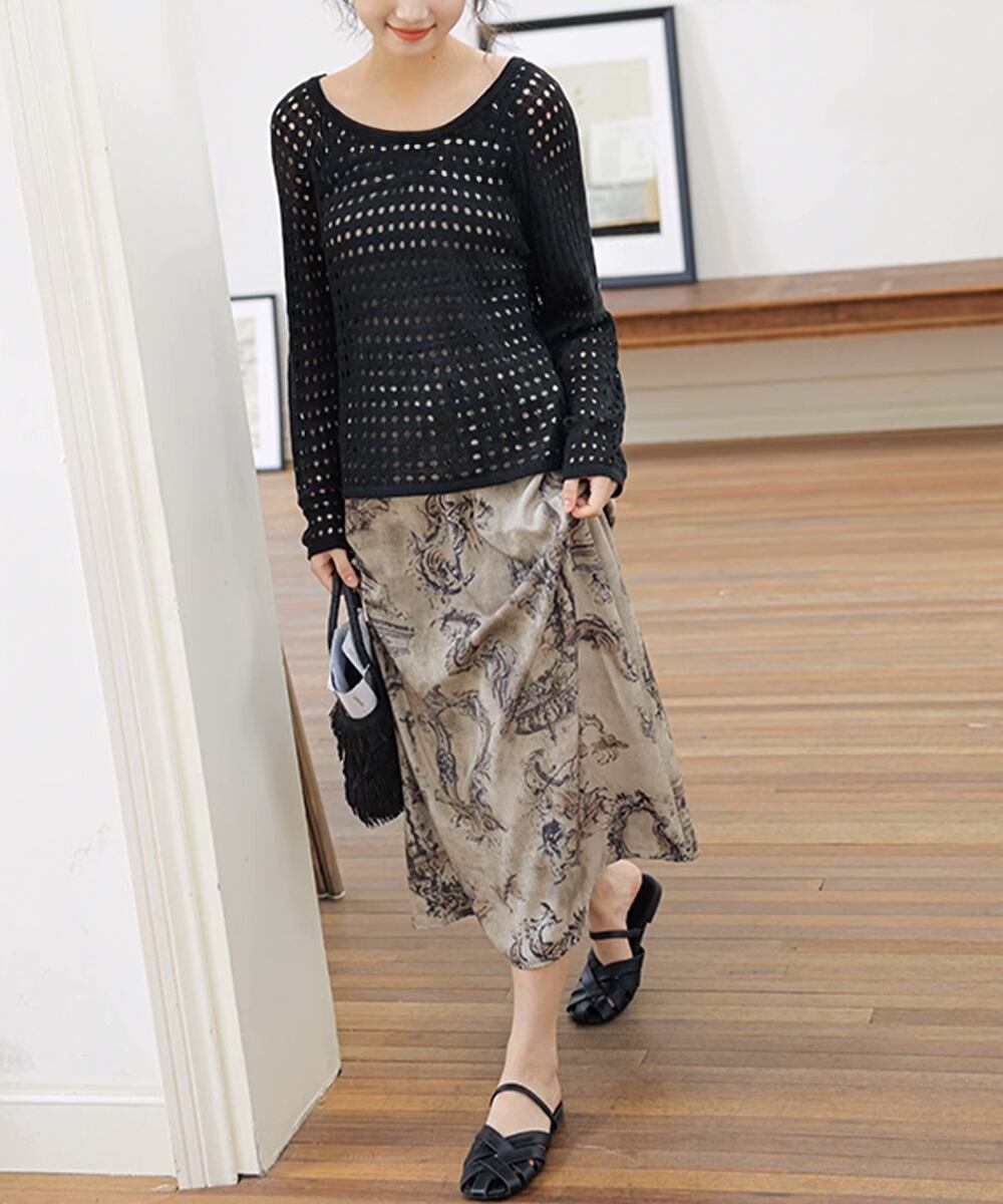 大人可愛いトップス 透け感ニット着やせ 韓国風肌見せニット