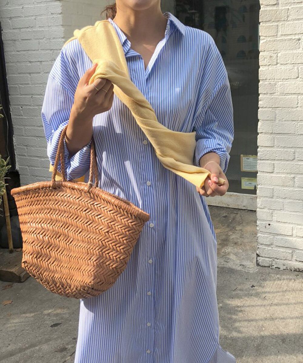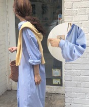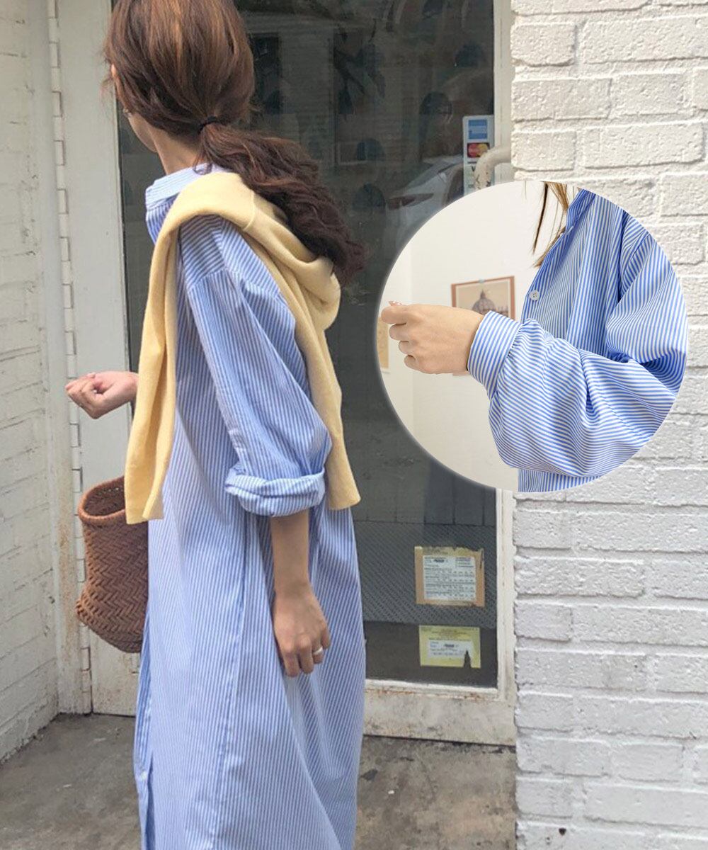 ストライプシャツワンピ ロングワンピースミモレ丈 カジュアル ボリュームスリーブシャツカーディガンサイドスリット 韓国風