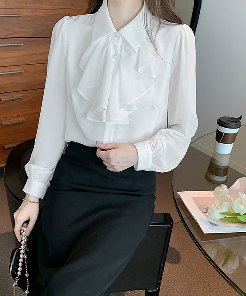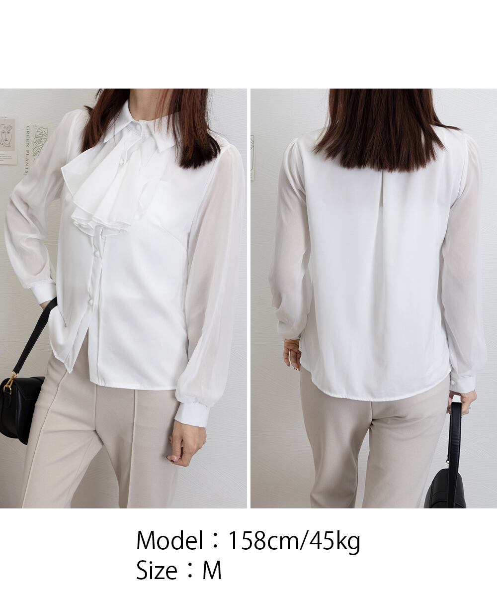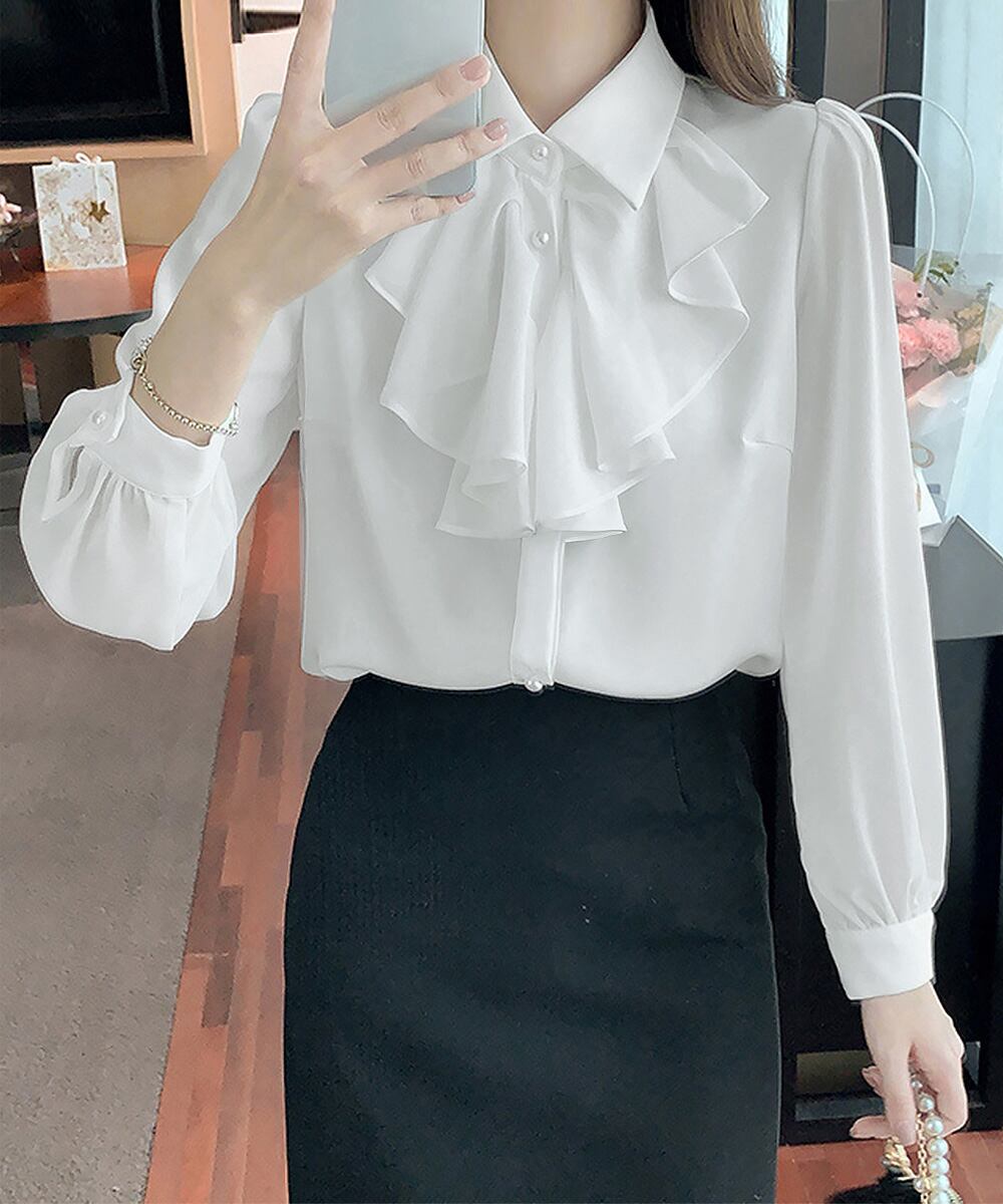 エレガントな雰囲気を漂わせるフリルリボンタイブラウス
