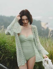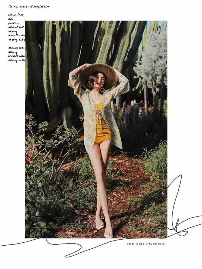 ・シンプルな単色ながら、バッグはフェイクビキニデザインで大人セクシー。