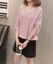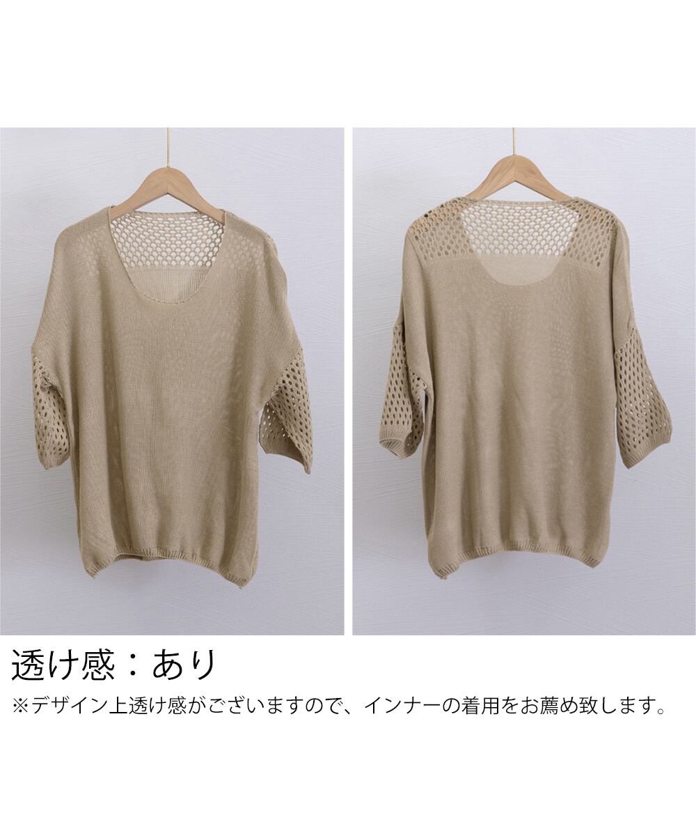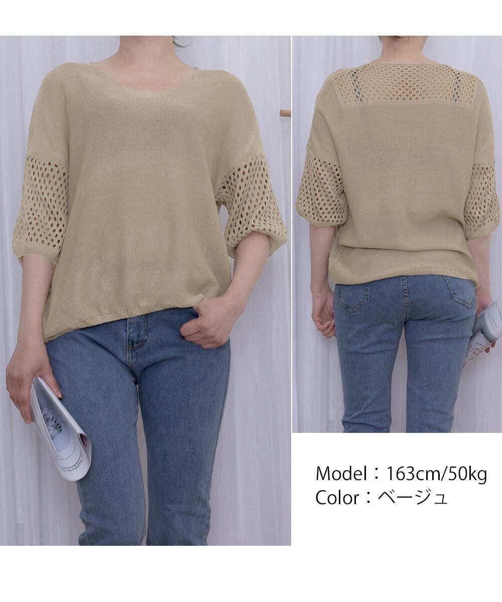 透かし編みスリーブがポイントの、涼しげな半袖ニットトップス