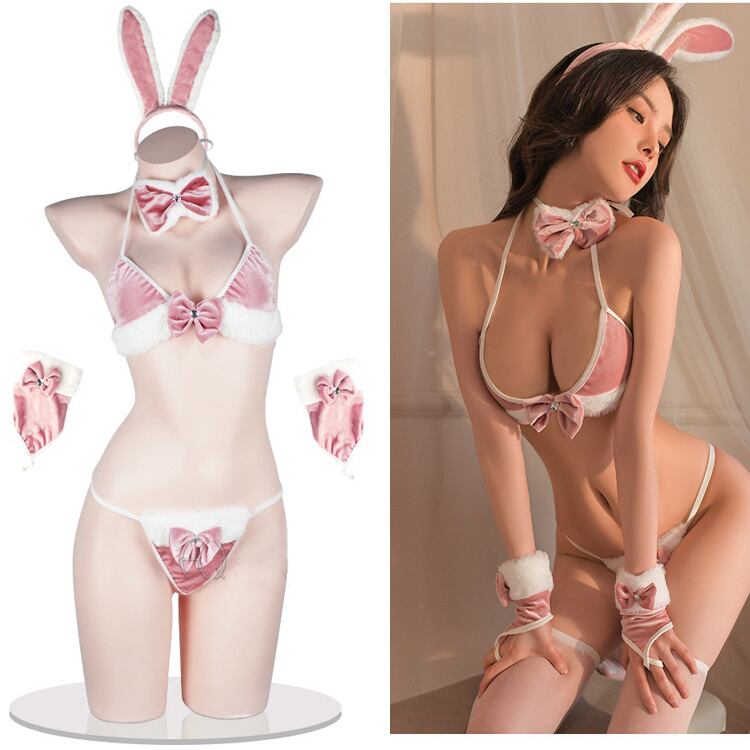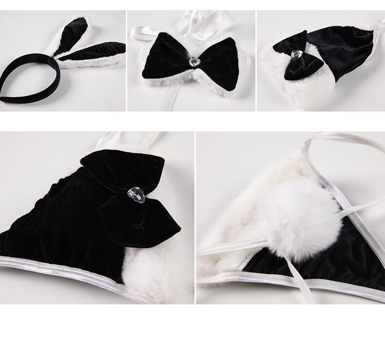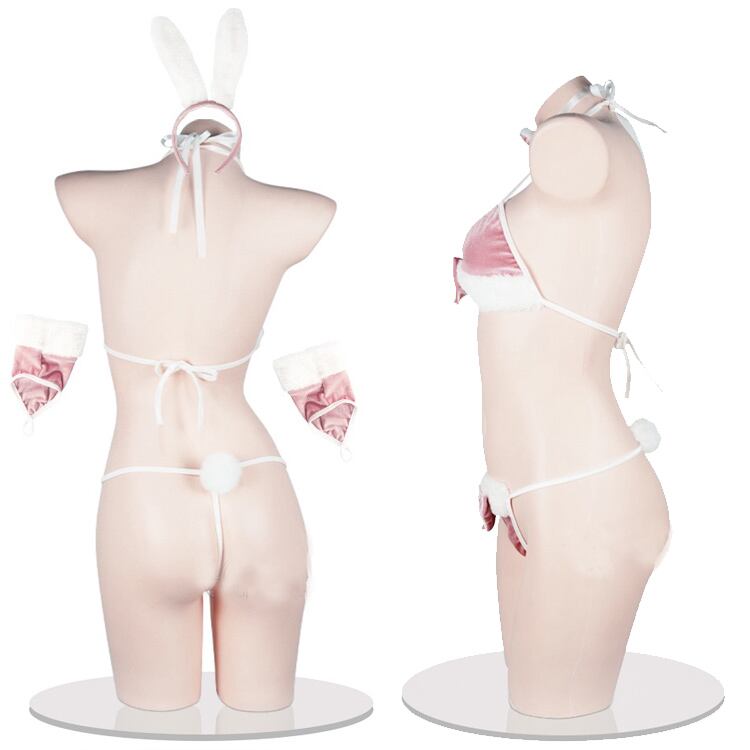兎耳カチューシャ、チョーカー、ブラジャー、しっぼ付きTバック、指なしグローブ