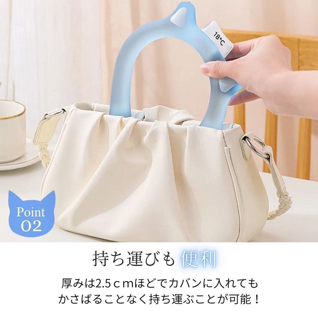 首や肩に負担のかかりにくいカーブ構造で通常の保冷剤と違い、大きな温度差がないため、表面が結露しにくい作りになっています。