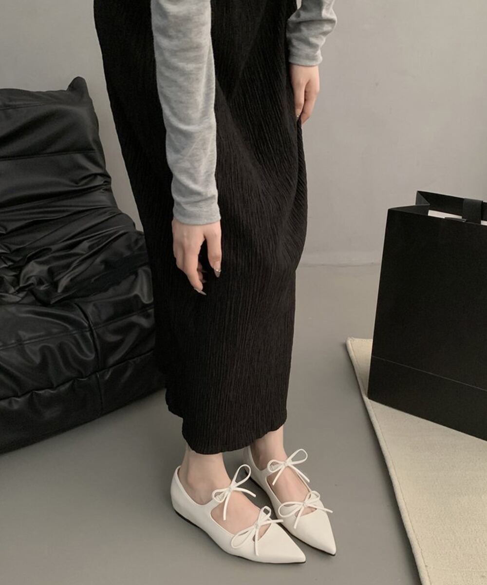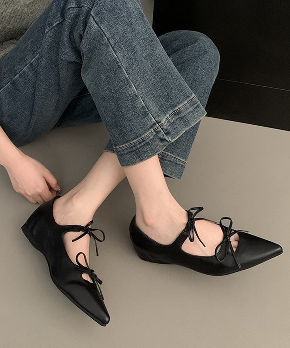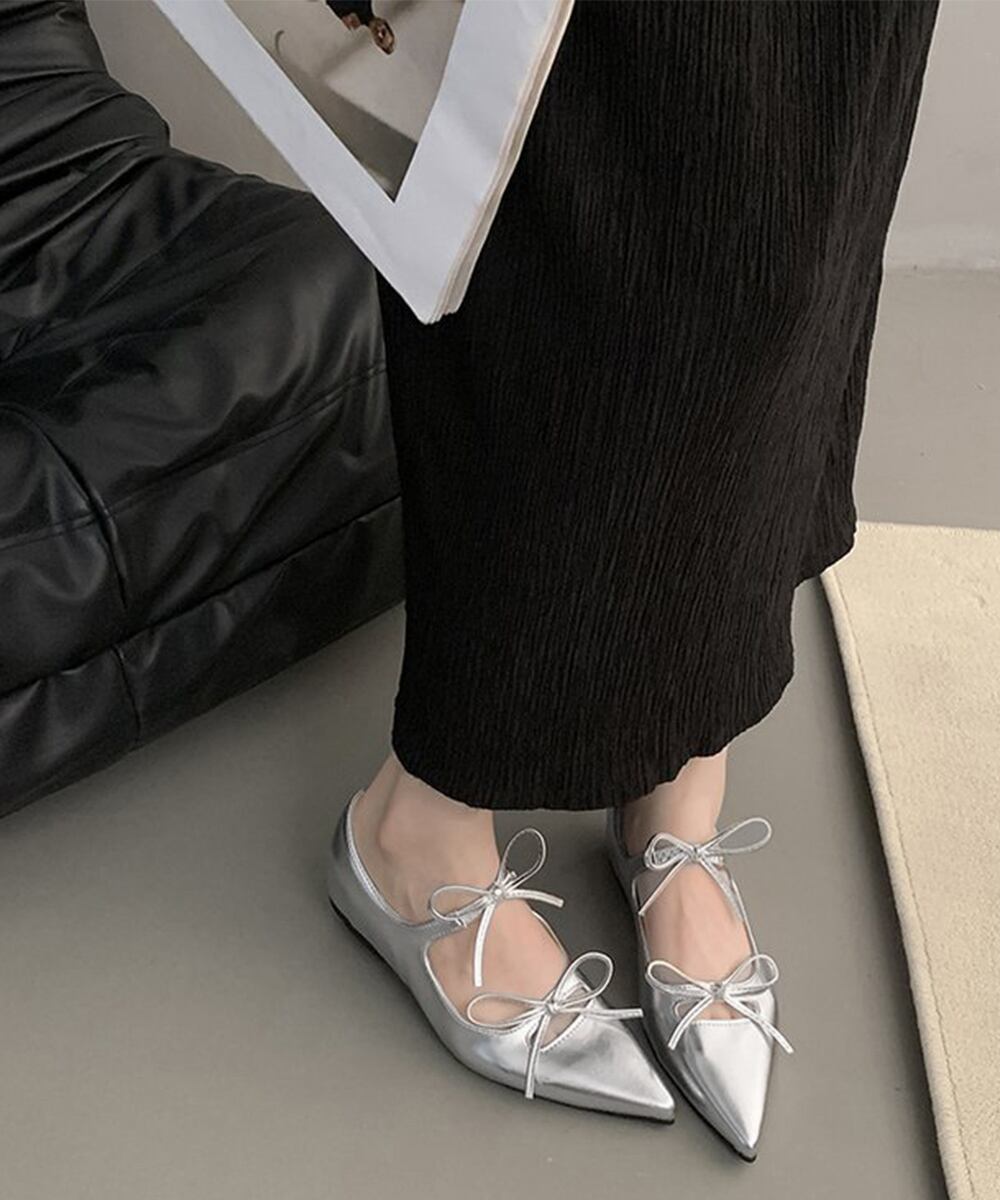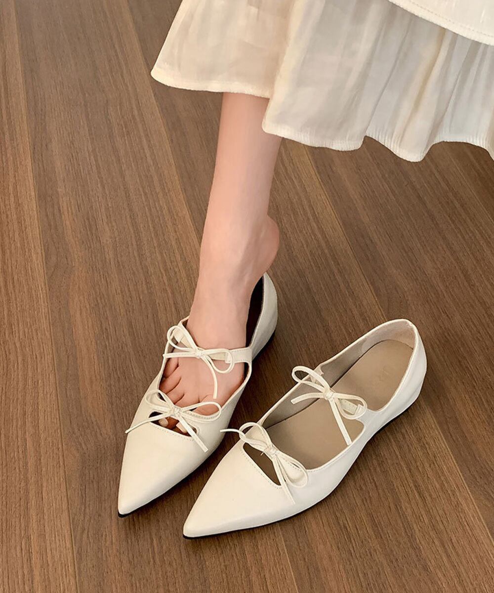 シャープなポインテッドトゥが目を引く、リボンストラップバレエシューズ。