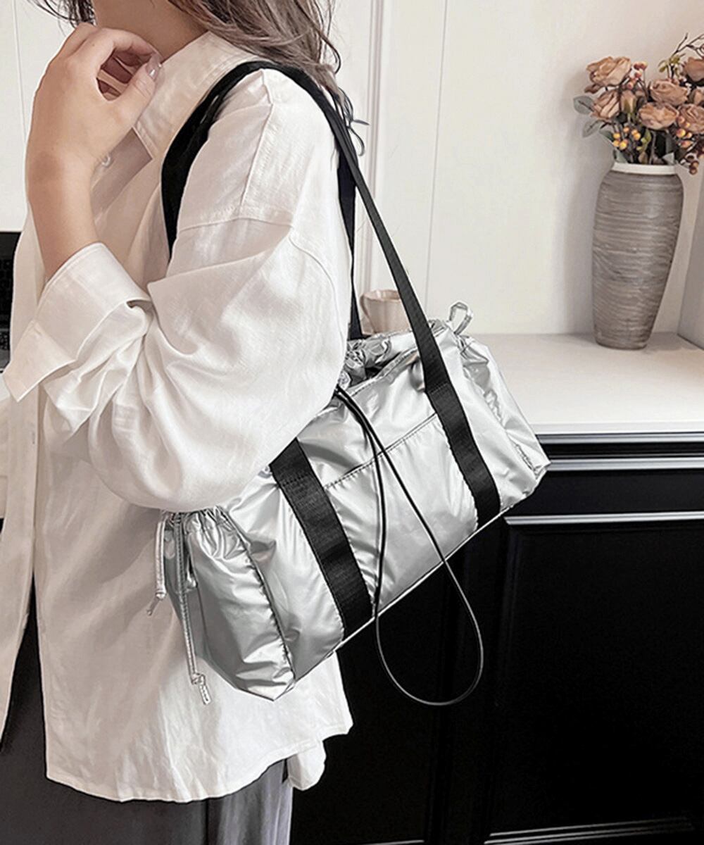 光沢感のある素材がコーデに華やかさを添え、シンプルながら存在感のある2WAYバッグ