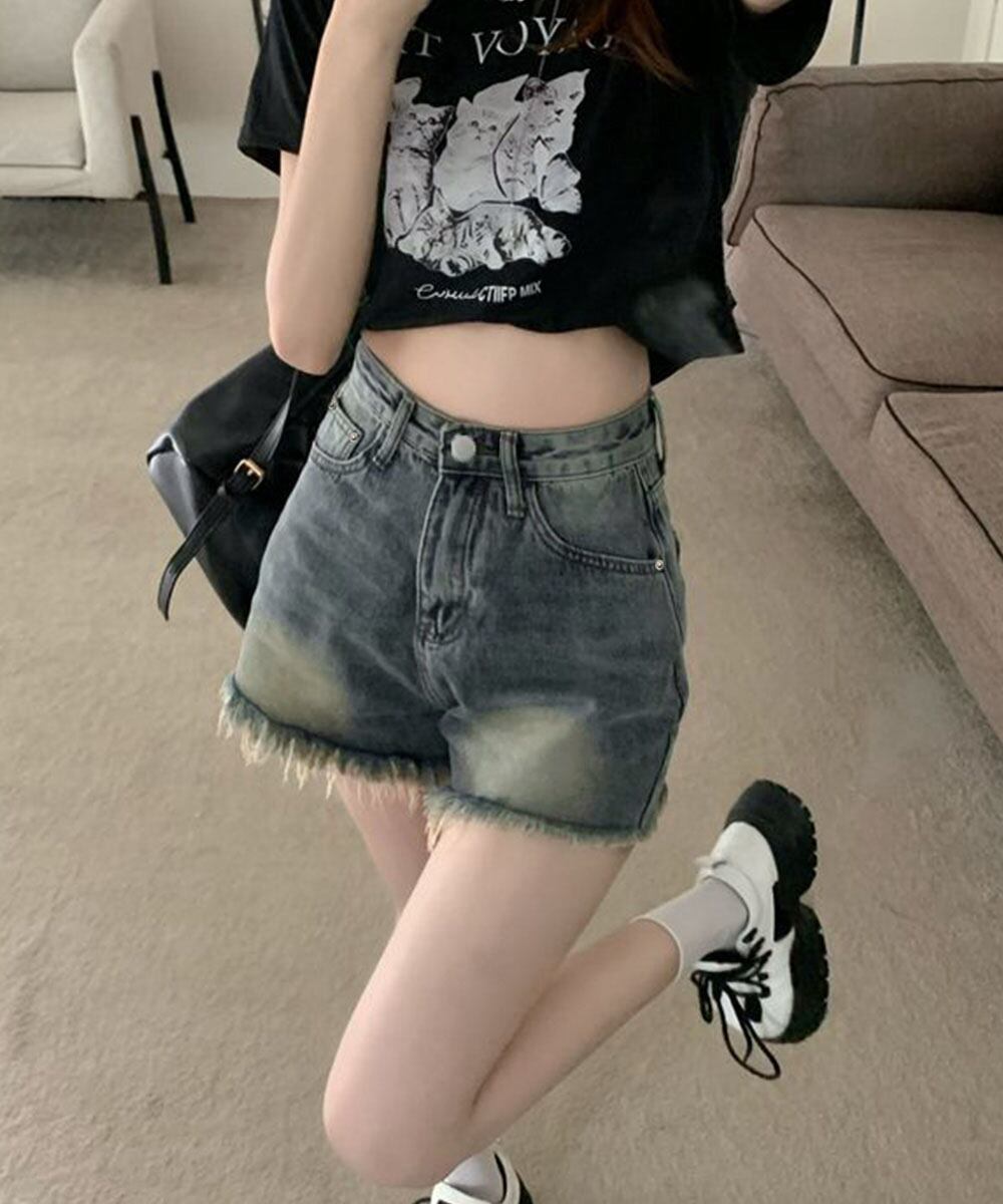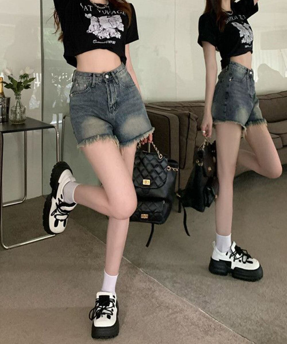 裾フリンジデニムショーパン 美脚脚長ジーパン おしゃれ アメカジホットパンツ細見え美尻ジーンズ レトロ短パン オルチャン
