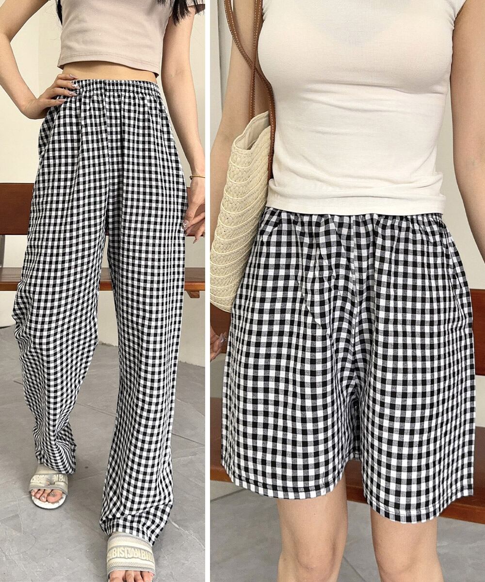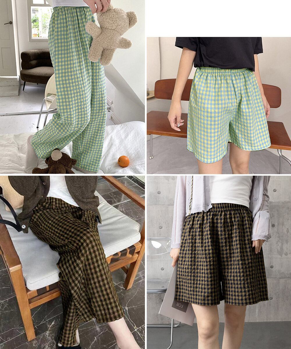 夏にぴったりな軽やかチェック柄パンツ、ショートとロングの2タイプから選べる。