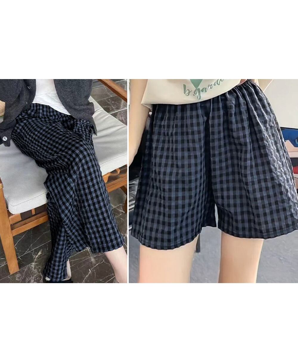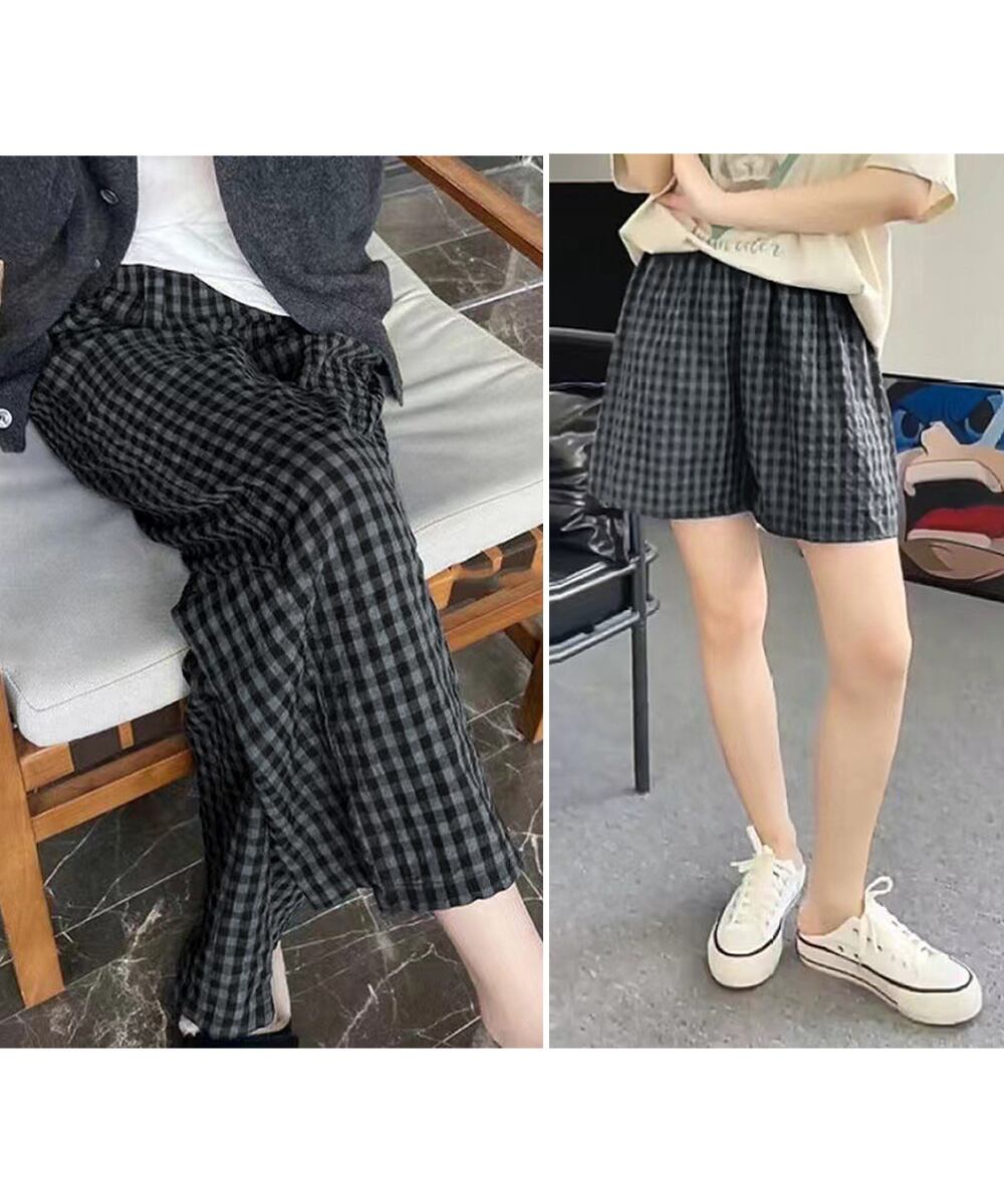 丈選べる チェック柄ロングパンツ涼しい 格子柄ショートパンツ ウエストゴム 着やせワイドパンツ 体型カバー 部屋着パンツ